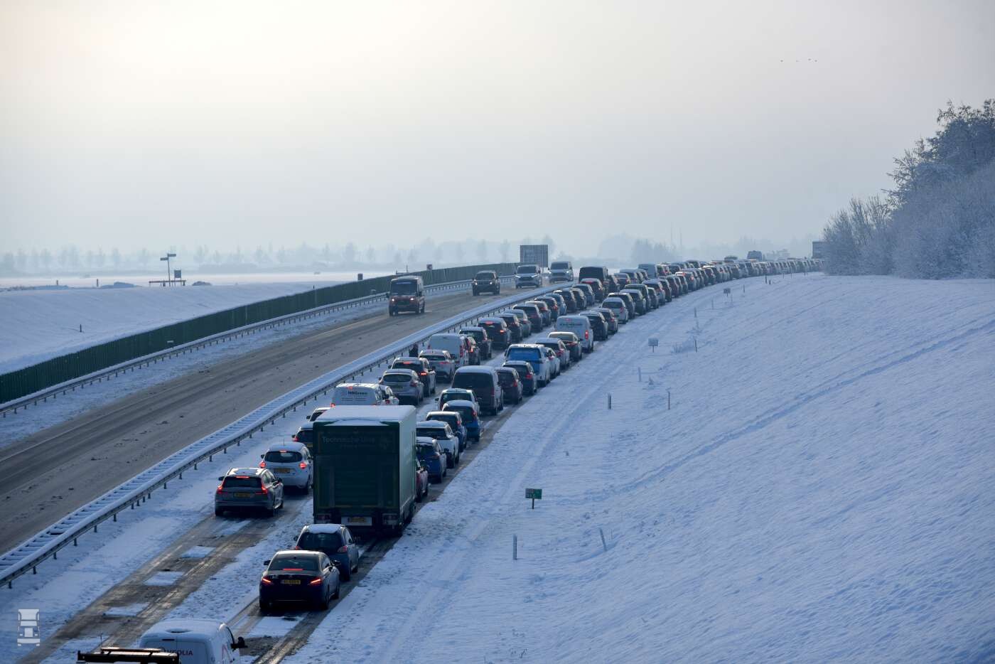 Het verkeer zat op de A32 maar liefst vier uur vast, tijd die door sommige automobilisten gebruikt werd om sneeuwpoppen te maken en sneeuwballengevechten te houden. Doordat de weg helemaal vast stond konden de sneeuwploegen alleen uit tegengestelde richting in actie komen. Ook dat ging niet zonder slag of stoot, want de sneeuwschuiver die je hier ziet stond al vast op de oprit.