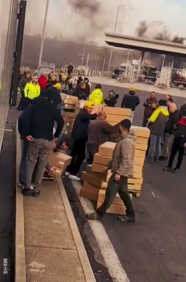 Een Poolse chauffeur fotografeerde de wantoestanden bij Béziers Oest. Daar werd hij tegengehouden, waarna zijn trailer werd opengebroken. De lading diepvries kip werd uit de trailer gehaald en deels vernietigd. De Franse politie kijkt toe hoe dit gebeurt, en ook hoe de dozen met kip in personenauto’s worden gestopt en afgevoerd. Dat is keiharde diefstal en dat heeft niks te maken met demonstreren volgens ons.