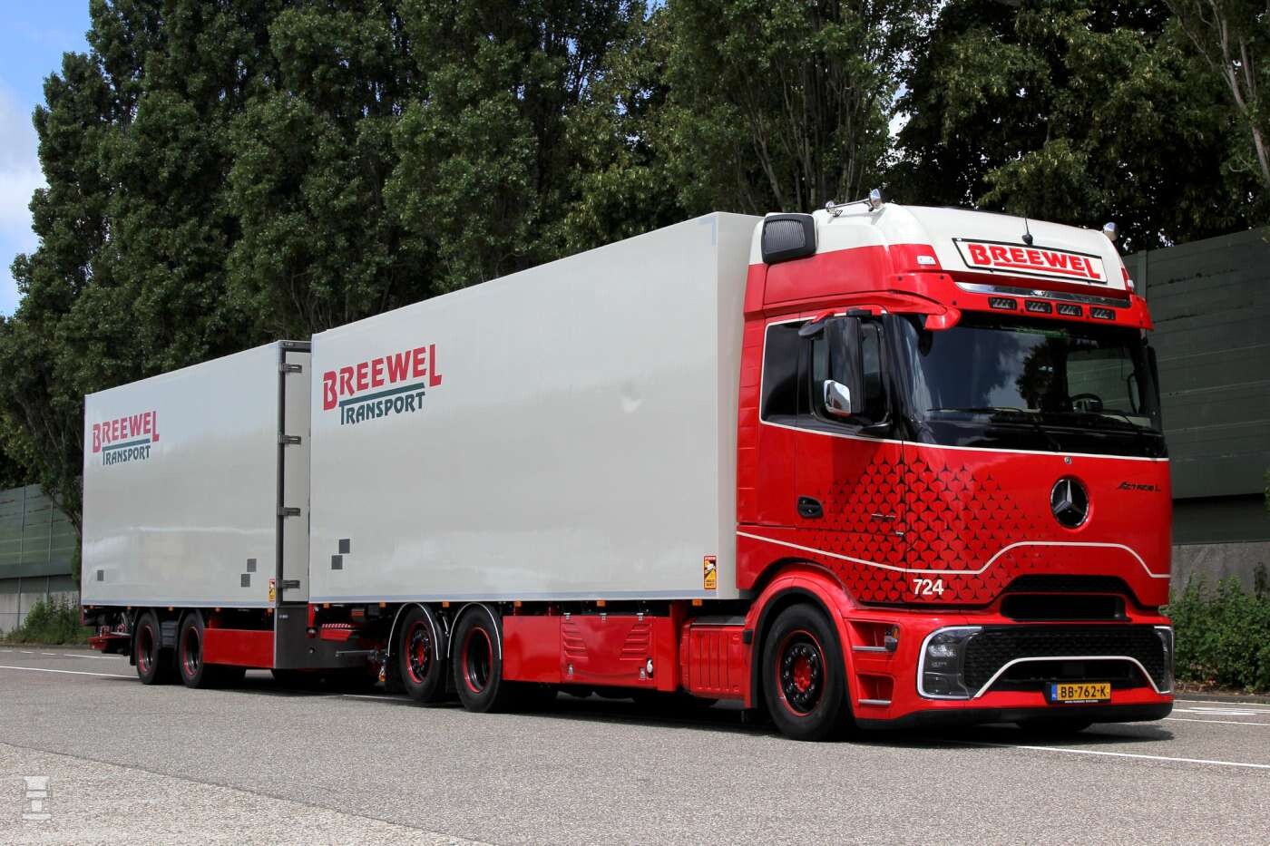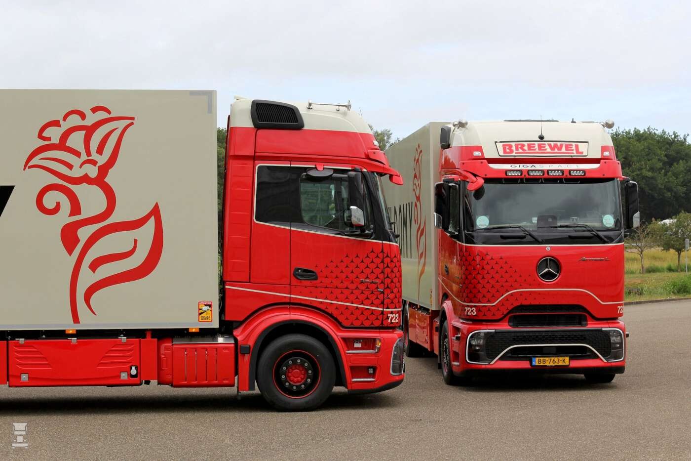 De Actros L GigaSpace cabines zijn voorzien van een in kleur meegespoten zonneklep met vier compacte LED verstralers, een LED lichtbak en een zwarte omlijsting van de raampartij. Verder is ook de luchtinlaat aan de rechterkant van de cabine in kleur gespoten. De asymetrische print met de gestyleerde Mercedes sterren maakt het plaatje af, met onderlangs nog een witte bies. Echt een ontwerp waar goed over nagedacht is en wat ons betreft bijzonder geslaagd. Meer over deze combi's met een opbouw van Ebo van Weel lees je hier!