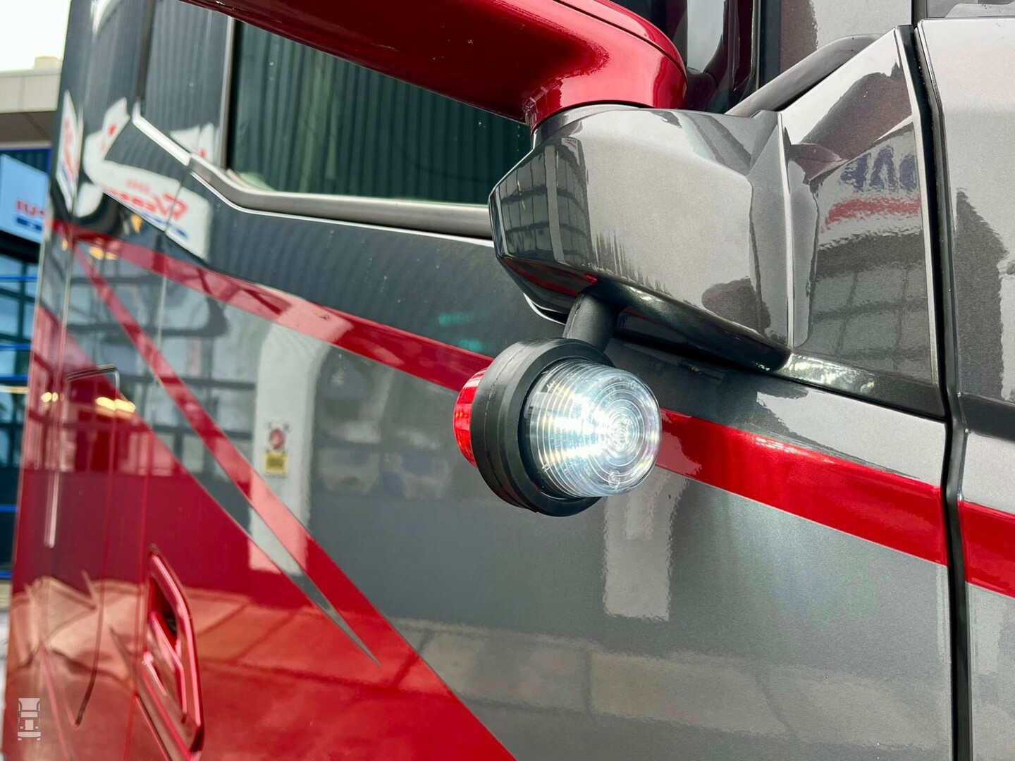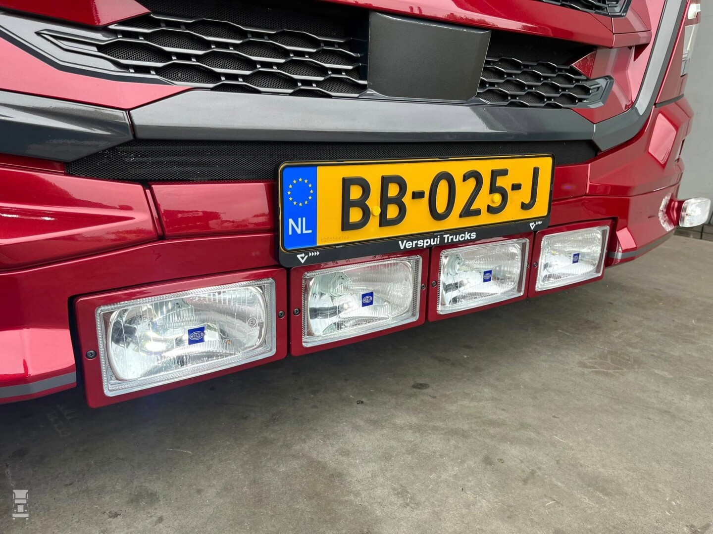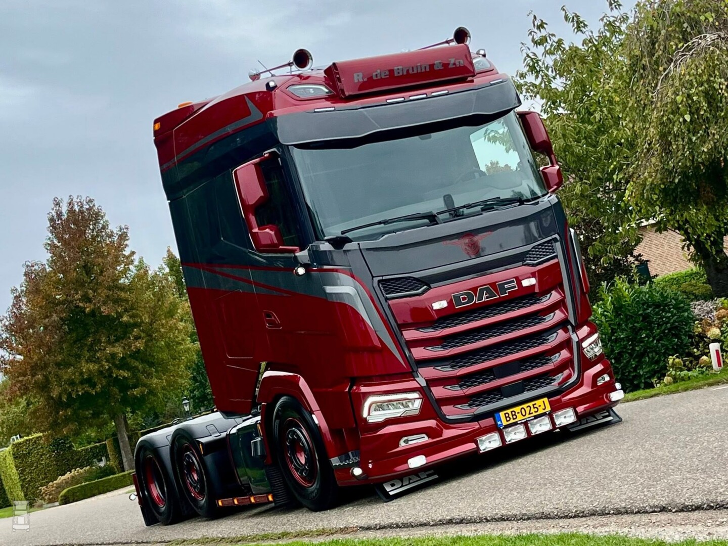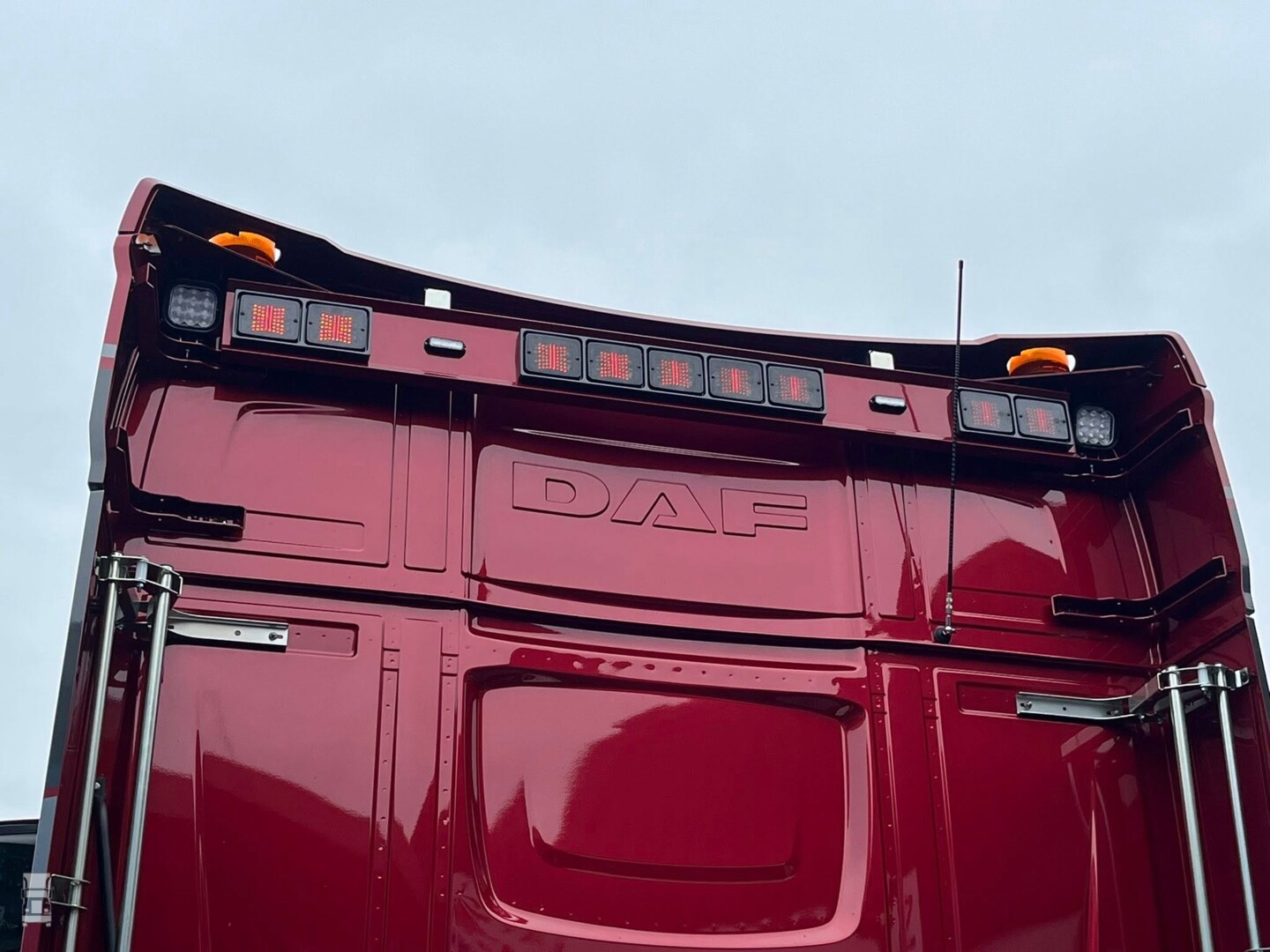 Zo is de voorloopas- trekker niet uitgerust met zijfenders, maar met glanzend gespoten brandstoftanks. Aan de achterkant werd een dikke bumper met bloklampen gemonteerd, en ook onder de topspoiler zijn bloklampen geplaatst. Verder zijn er lichtlatten aan de zijkanten, een Go-In-Style onderspoiler en zonneklep en een Deense lichtbak gemonteerd. Samen met de windkappen op de hoeken en de extra verlichting ziet het er indrukwekkend uit. Leuk detail, de rode kleur is eigenlijk een Scania kleur, maar dat misstaat de DAF beslist niet!