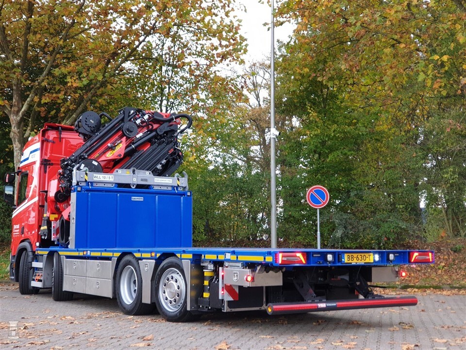 Achter de kraan bevindt zich een ruime laadbak. Achter de twee 10-tons voorassen zijn verschillende praktische opbergkisten gemonteerd. De Scania is rondom voorzien van veel LED werkverlichting. Chauffeur Gerard is dan ook uitermate trots op zijn nieuwe aanwinst. We hopen dat hij ons het matige woordgrapje in de titel vergeeft en wensen hem veel veilige kilometers.