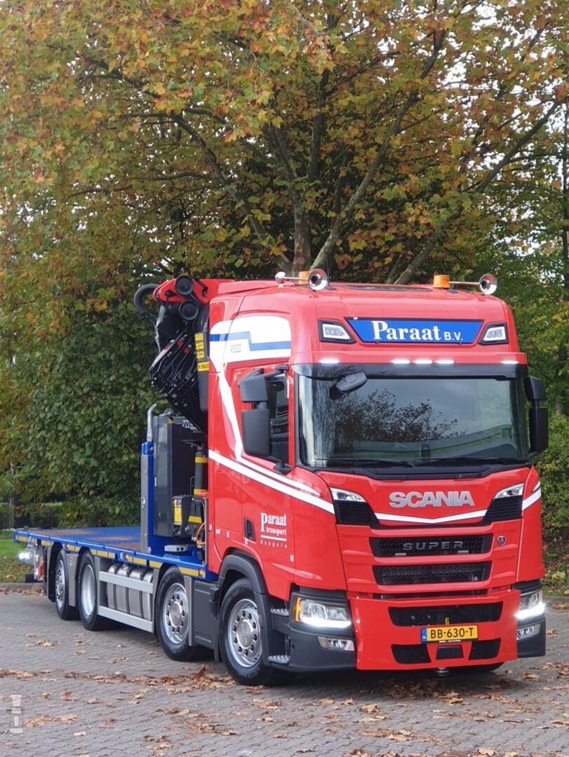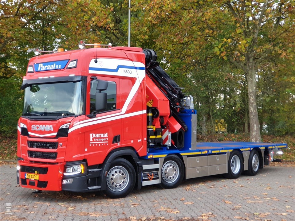 De vierassige Scania is de nieuwste aanwinst van het bedrijf uit Hengelo, dat zich vooral bezighoudt met speciaal transport. Hiervoor beschikt het over een indrukwekkende vloot van flinke vrachtwagens. De nieuwe Scania R500 kan zich meten met de rest. Voorzien van een flinke Palfinger kraan is dit een indrukwekkend stuk gereedschap. De kraan is voorzien van verzwaarde afstempeling voorop, zodat de kraan alle kanten op kan.