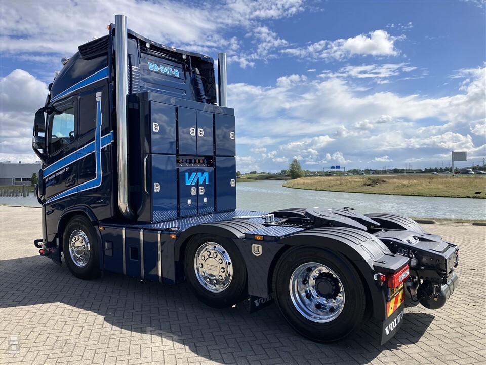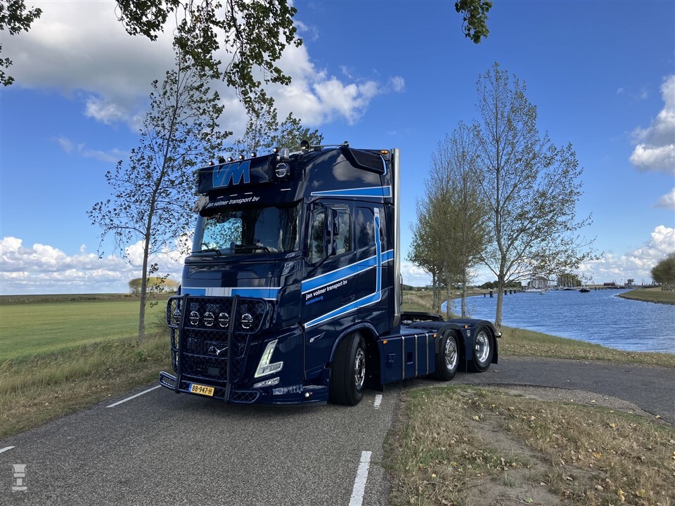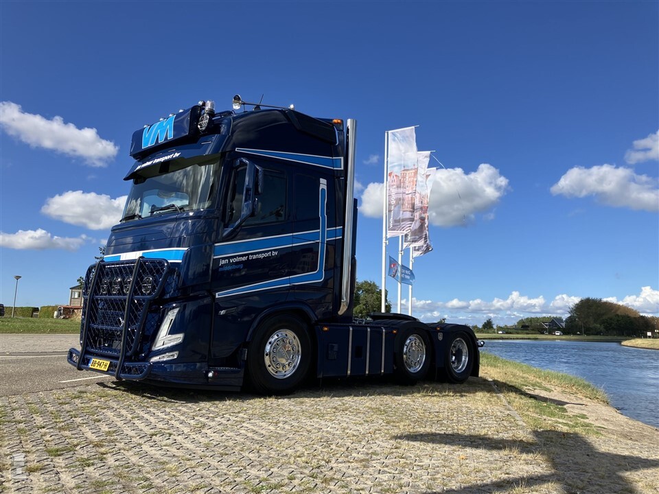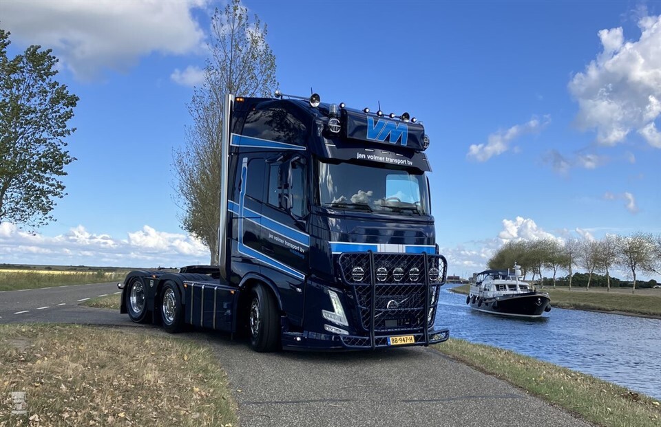 Dat de Volvo FH Aero vooral bedoeld is om de luchtweerstand te verminderen, houdt niet iedereen tegen om hem dik aan te kleden. Jan Volmer Transport bijvoorbeeld besloot hun nieuwe Volvo op te bouwen tot echte blikvanger. Het gestroomlijnde frontje kreeg een fikse bullbar met vijf verstalers. Meer verlichting vond een plaats op het dak, naast de lichtbak en voor de luchthoorns. Achter de cabine werden twee staande uitlaten opgebouwd. Deze zijn aangesloten achter de uitlaatdemper.