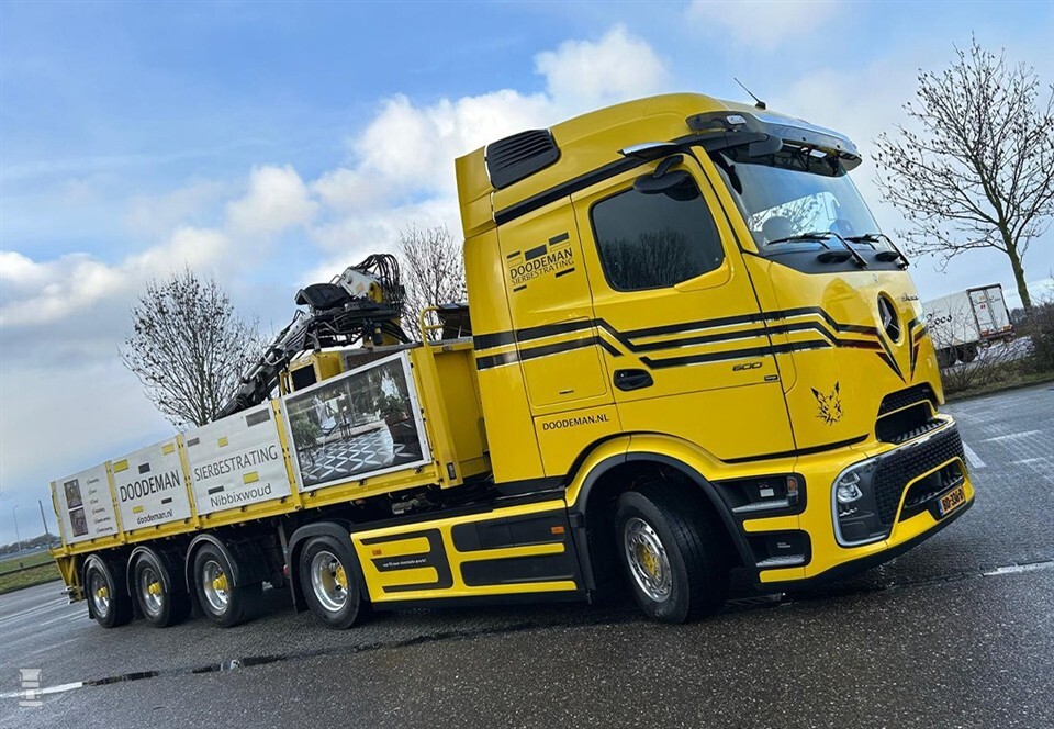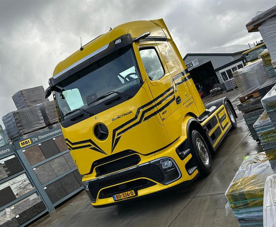 “Van V8 naar electrische pracht” staat vol trots op de zijfenders van de nieuwe eActros 600 van Doodeman Sierbestrating. De elektrische vrachtwagen is een opvallende verschijning. De knalgele lak straalt je tegemoet en met een beetje fantasie zie je bliksemschichten in de zwarte strepen. De afbeelding van Pikachu is dan ook niet erg vergezocht. Doodeman is duidelijk blij met zijn nieuwe aanwinst.