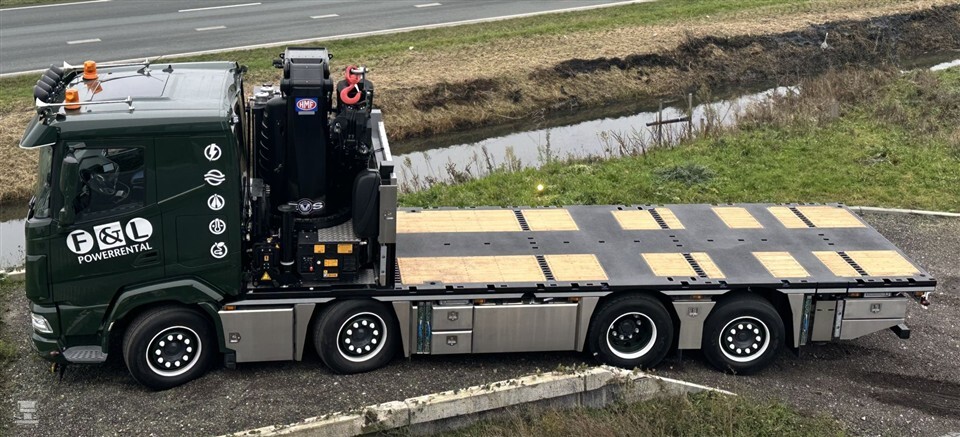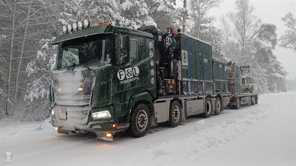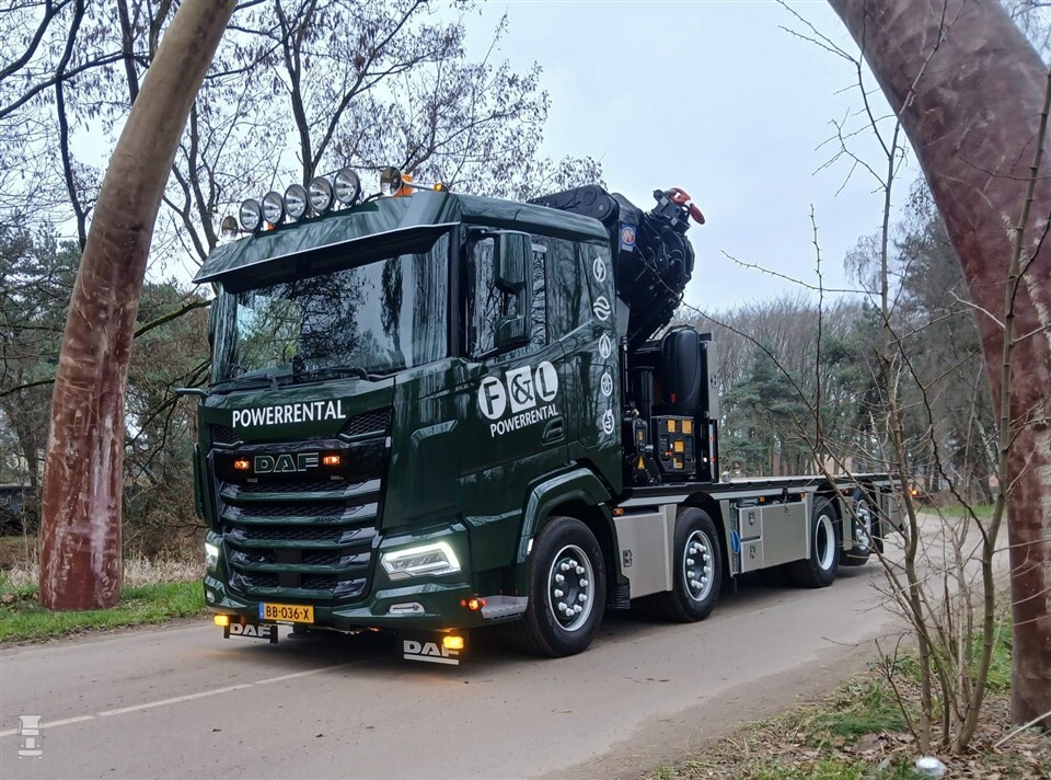 F&L Powerrental, met vestigingen in Heinenoord en Hoogeveen, voorziet klanten van stroom, water, licht en warmte. Het verhuurt apparatuur aan iedereen die dit nodig heeft. Om de soms overmaatse apparaten op locatie te krijgen, heeft het bedrijf een nieuwe vrachtwagen aangeschaft. De donkergroene DAF XF 530 8x4 is eind vorig jaar afgeleverd en mocht zijn eerste rondjes rijden in het winterse weer van vorige week.