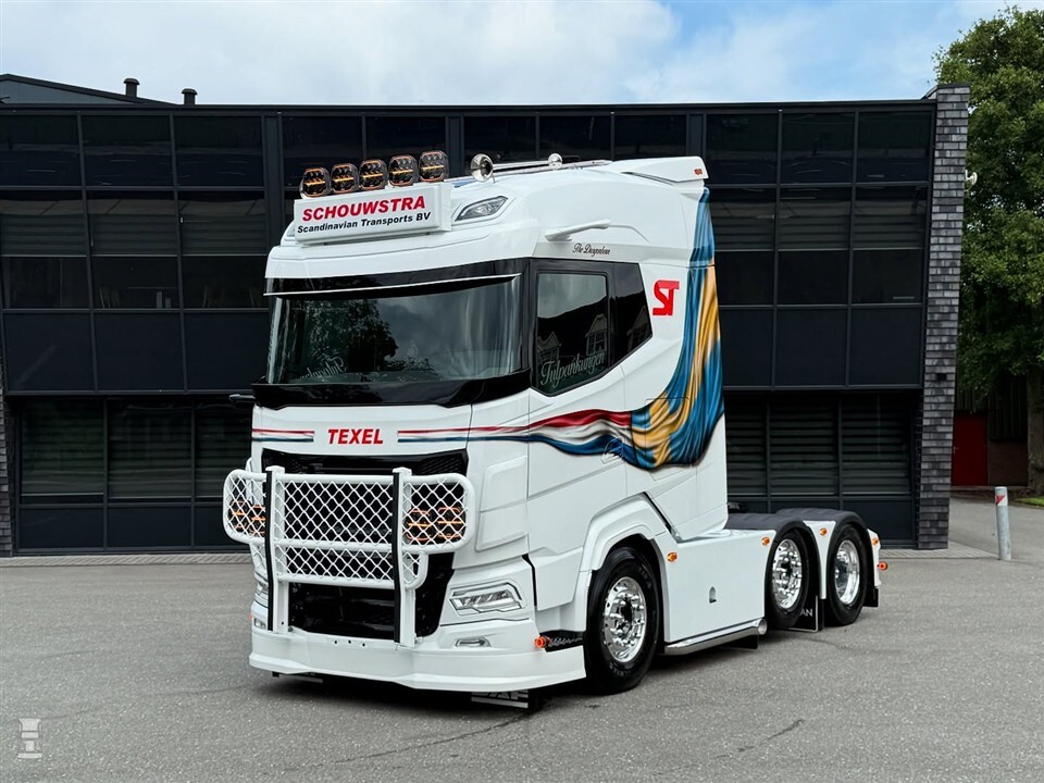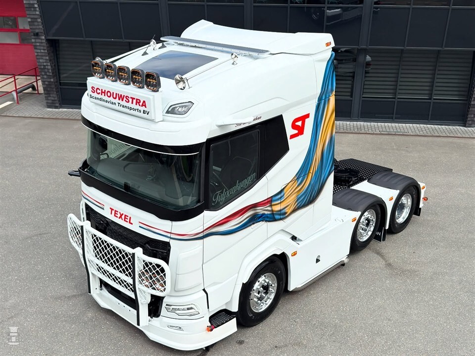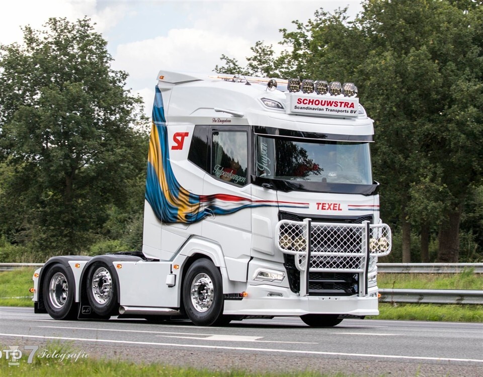 Schouwstra Transport staat al bekend om zijn mooie vrachtwagens en de nieuwste aanwinst is hier geen uitzondering op. Sterker nog, de DAF XG doet er nog een schepje bovenop. De witte DAF is door Truckspuiterij Bronk in de kenmerkende bedrijfskleuren gespoten, waarbij de Nederlandse vlag overgaat in de Zweedse. Uiteraard kreeg de DAF ook een bullbar, die strak afsteekt tegen de zwarte grille.