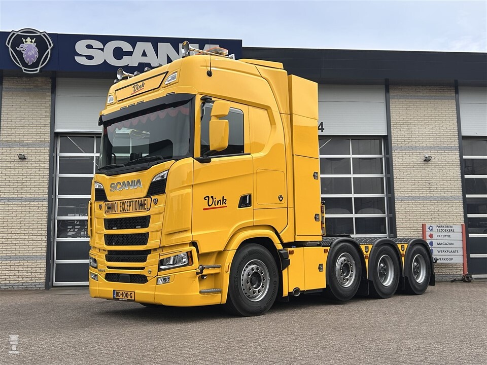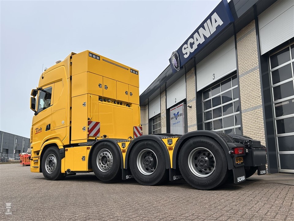 Het gaat hier om een Scania S660 8x4/4NB. Met de grote S-cabine, vier assen en een stoere V8 is dit sowieso al een trekker om je vingers bij af te likken. Hij is echter ook uitgevoerd als luxe King of the Road. De trekker heeft een korte wielbasis van 3.650 mm tussen de eerste en derde as. De tweede as is door Scania in Södertälje geplaatst. De schuifschotelopbouw met kisten is door Vink zelf ontwikkeld.