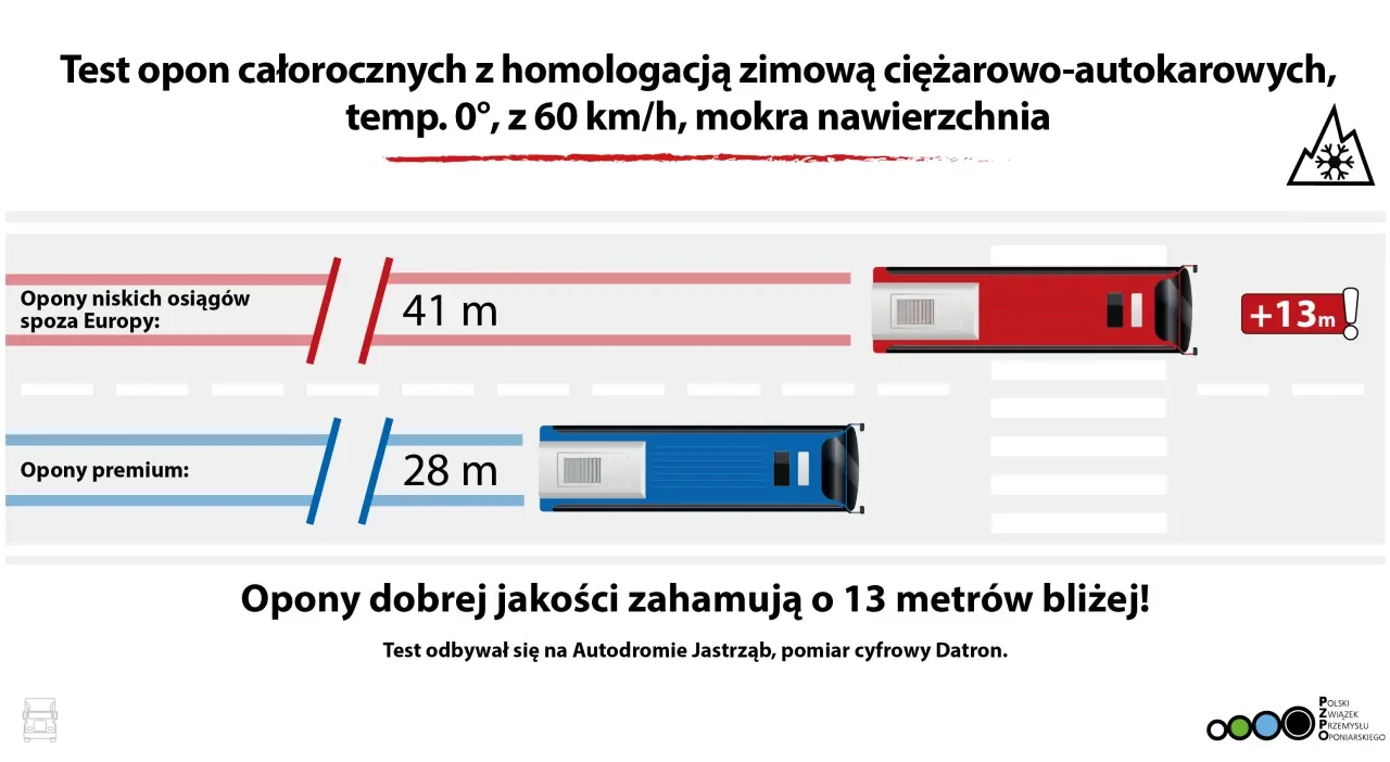 Ter verduidelijking: de Poolse bandenindustrieorganisatie heeft helaas geen informatie verstrekt over de exacte bandenmerken die in de test zijn gebruikt. De markeringen op de zijwand waren zelfs onleesbaar gemaakt. Dit komt waarschijnlijk doordat de goedkoopste bandenmerken zonder medeweten van de fabrikanten zijn verkregen, en publicatie van deze tekst zou kunnen leiden tot beschuldigingen van merkschade (de Poolse wetgeving op dit gebied is zeer streng). Bron: 40ton.net