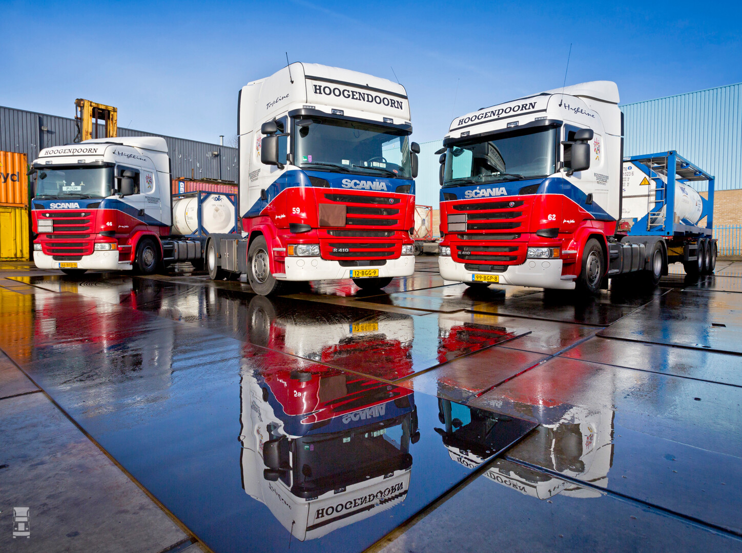 Hoogendoorn is actief in het ADR-vervoer met tankchassis en containers. Het bedrijf omvat 32 trekkende eenheden waarvan het overgrote merendeel Scania. “Onze voertuigen zijn vrij standaard uitgevoerde ADR-gekeurde trekkers. Wel hebben we gekozen voor een aantal Premiumopties zoals de luxe chauffeursstoel en de multimedia geluidsinstallatie. Ook hebben we op elk voertuig een PTO-aangedreven compressor. Om de chauffeurs voldoende ruimte in de cabine te gunnen, zetten we RVS-kisten aan het chassis. Sowieso: je wilt in dit soort transport niet alle noodzakelijke koppelingen en slangen in de cabine hebben. Net zomin als de hele veiligheidsuitrusting van de chauffeur.”