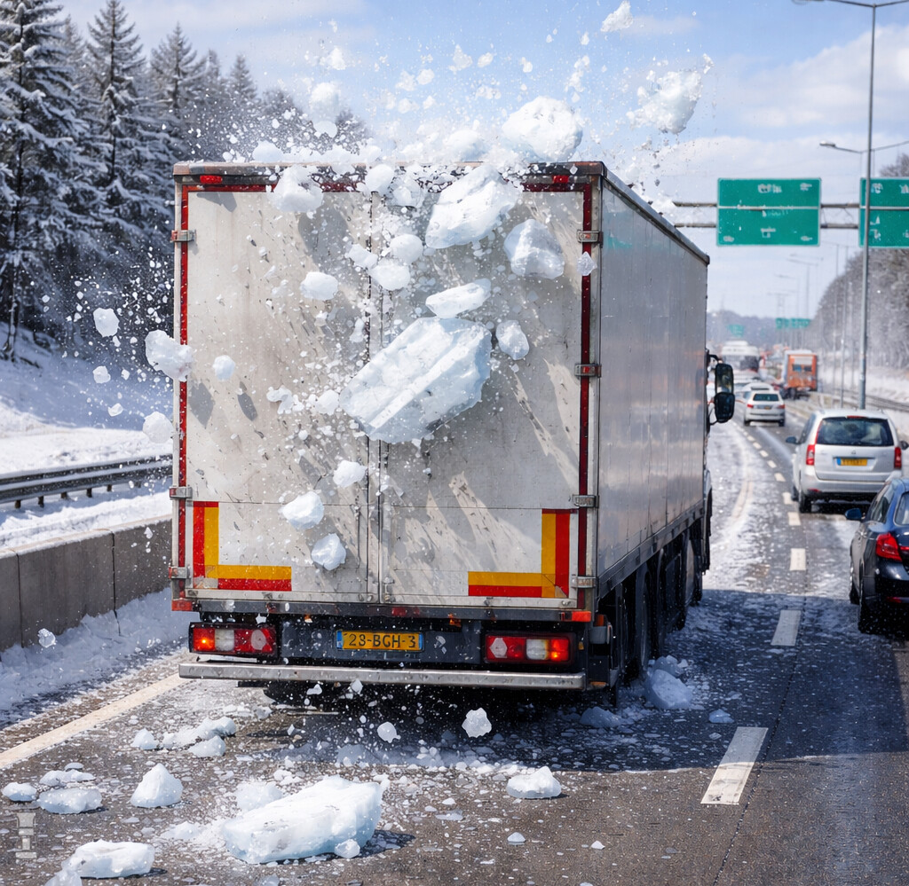Op een vier meter hoge trailer klimmen in de vrieskou is Arbo technisch niet verantwoord en veilige steigers waar je langs, of onderdoor kunt rijden voor inspectie of het schoonmaken van het dak zijn er bijna niet. Toch blijft het een punt van aandacht. Vandaag raakte op de N50 nog een chauffeur gewond door ijs dat van een andere truck kwam, en door zijn voorruit vloog.