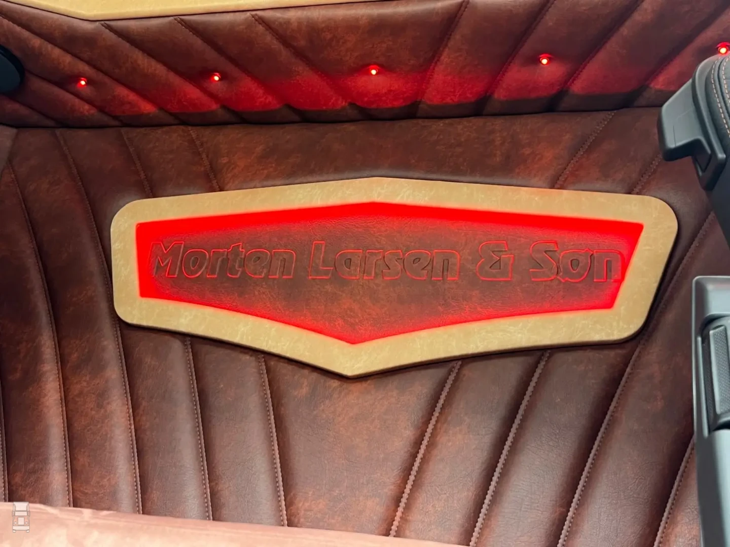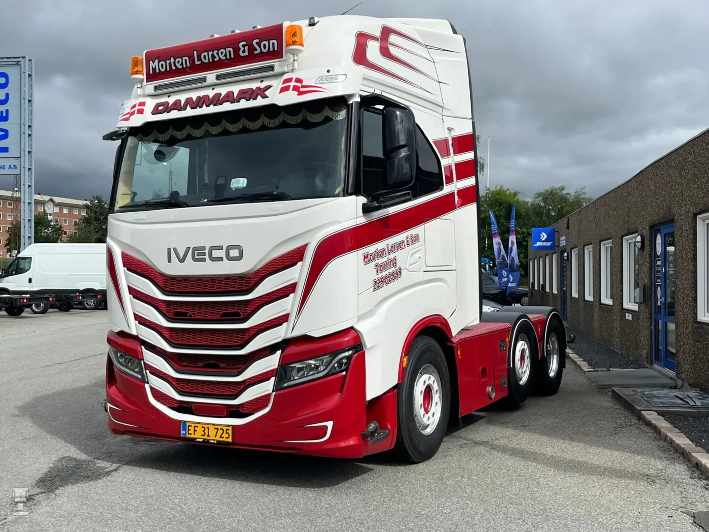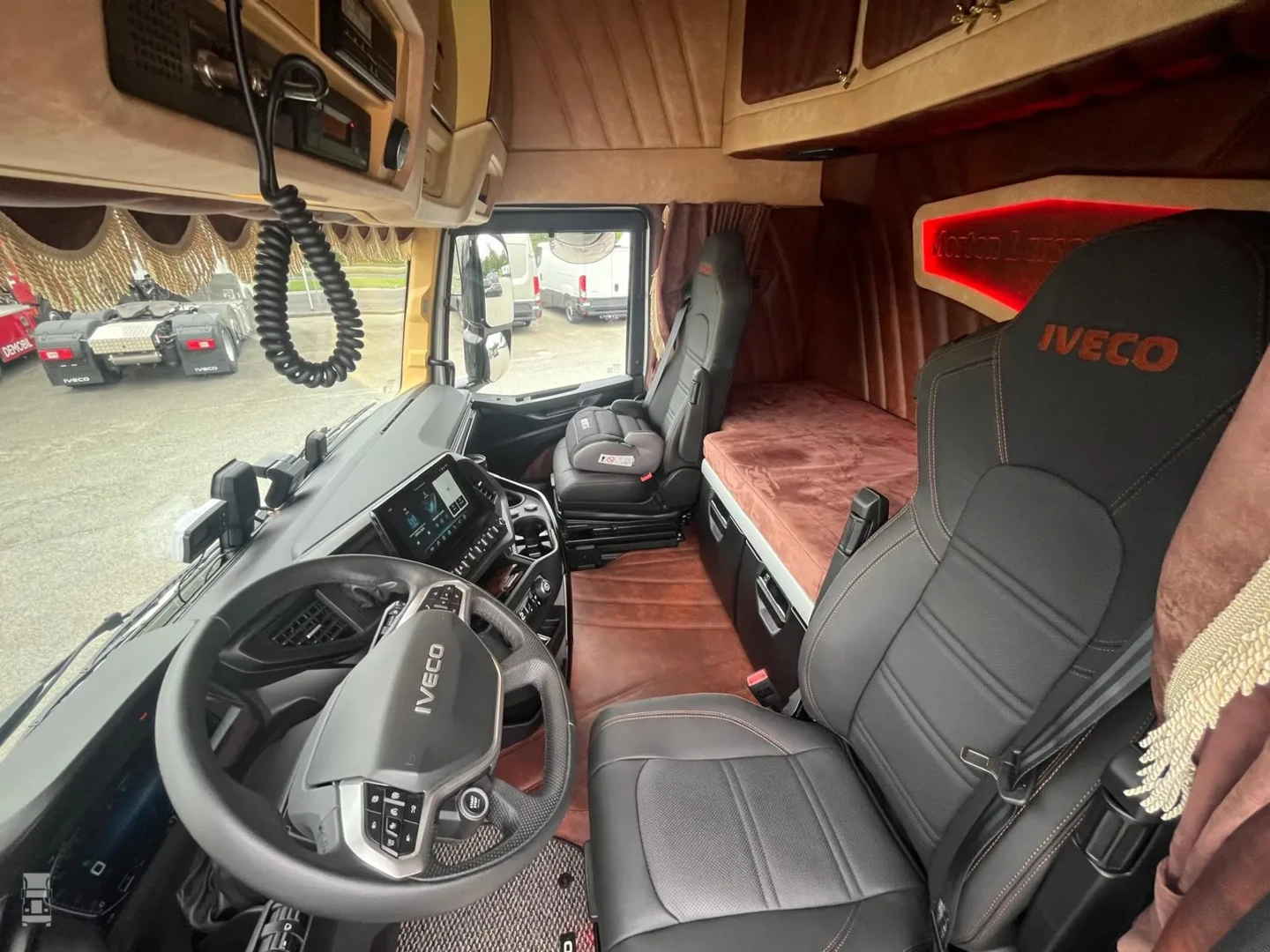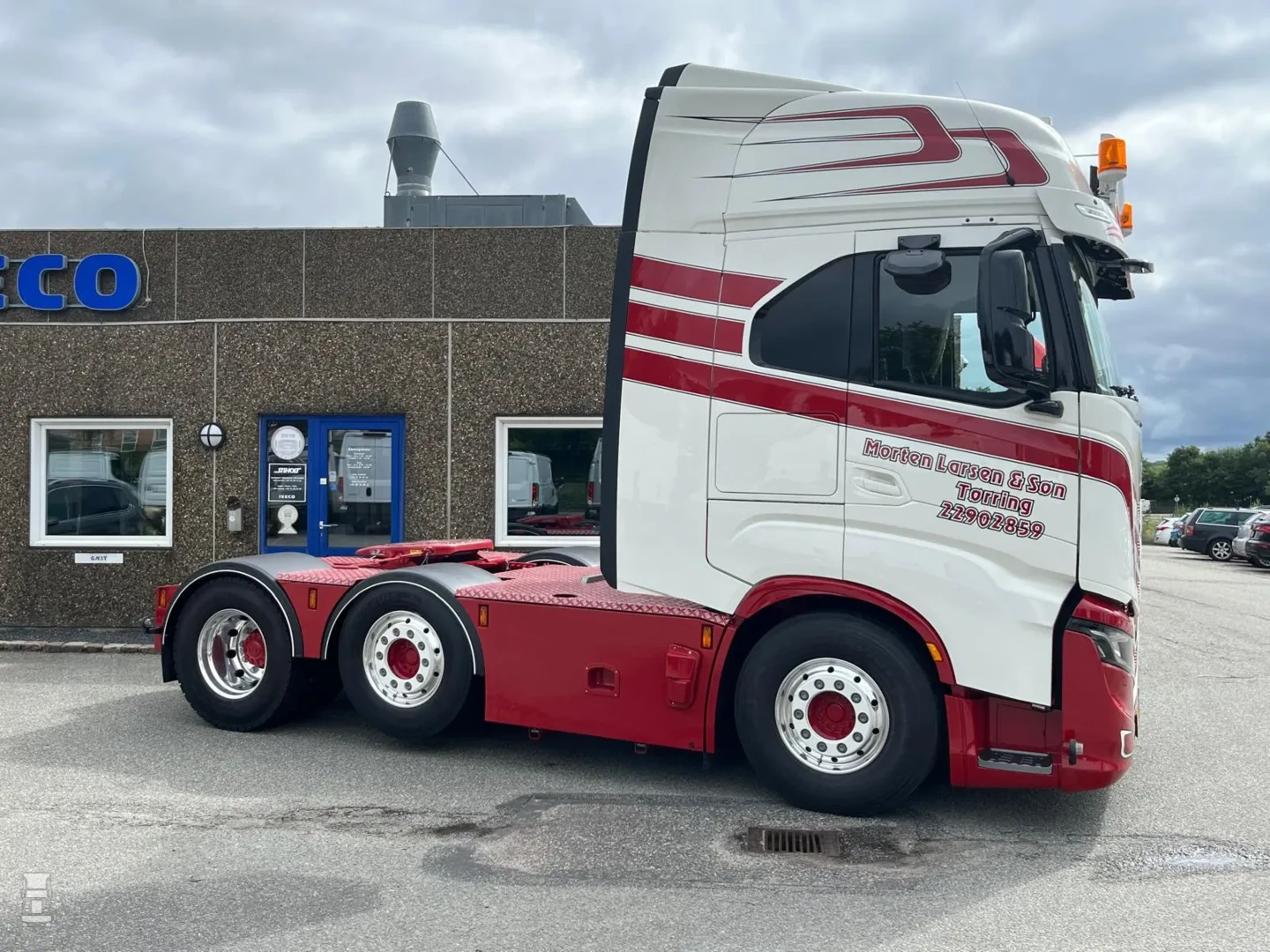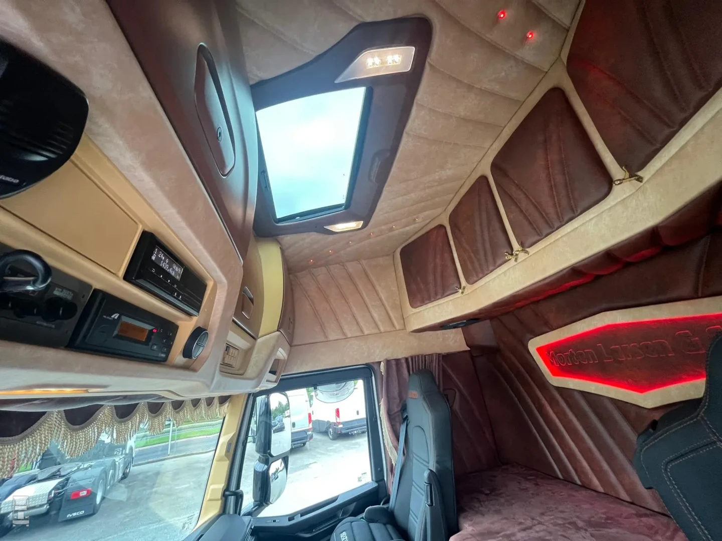 De truck is van het nieuwe model, dus met dat fraaie nieuwe dashboard en de start knop op het stuur, net als bij Ferrari. Aan de buitenkant werd de truck onder handen genomen met, uiteraard een Deense lichtbak, met daar onder twee LED bars. Verder werd de zonneklep in kleur gespoten en werd het chassis voorzien van een dichte tranenplaat, stalen zijfenders en een speciale achterbumper. Larsen koos niet voor het Iveco camera systeem maar liet conventionele spiegels monteren.