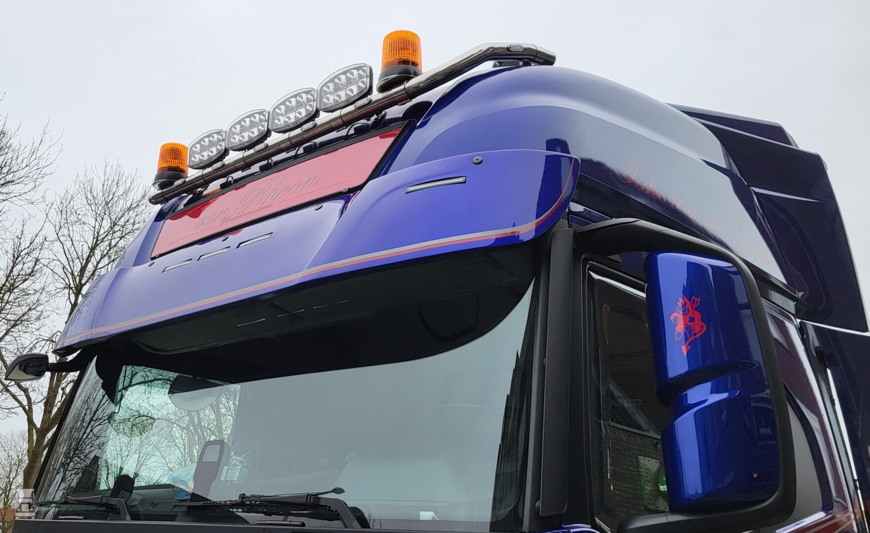 Naast de striping en de belettering werd er een lampenbeugel gemonteerd en werden er vier Ledson lampen in de grille geplaatst. Verder werd er een diepere zonneklep gemonteerd en daar boven een LED lichtbak.