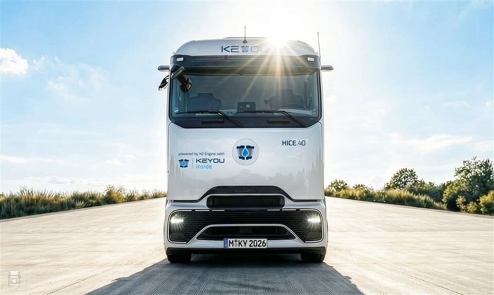 Volgend jaar komt Keyou met een nieuwe vrachtwagen. De HICE.40 is een zware trekker, gebaseerd op de nieuwste Actros L. Het uiterlijk is nauwelijks veranderd, maar de dieselmotor is vervangen door eentje op waterstof. Deze 12,8 liter motor produceert 476 pk en valt in dezelfde Maut-categorie als elektrische vrachtwagens. Met 65 kilo waterstof onder 350 bar heeft de Keyou HICE.40 een bereik van zo’n 650 kilometer bij 40 ton. De trekker weegt 9.600 kilo en is goedgekeurd voor 40 ton. Ook kan hij ADR-gecertificeerd worden.