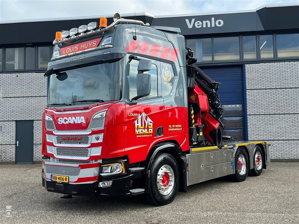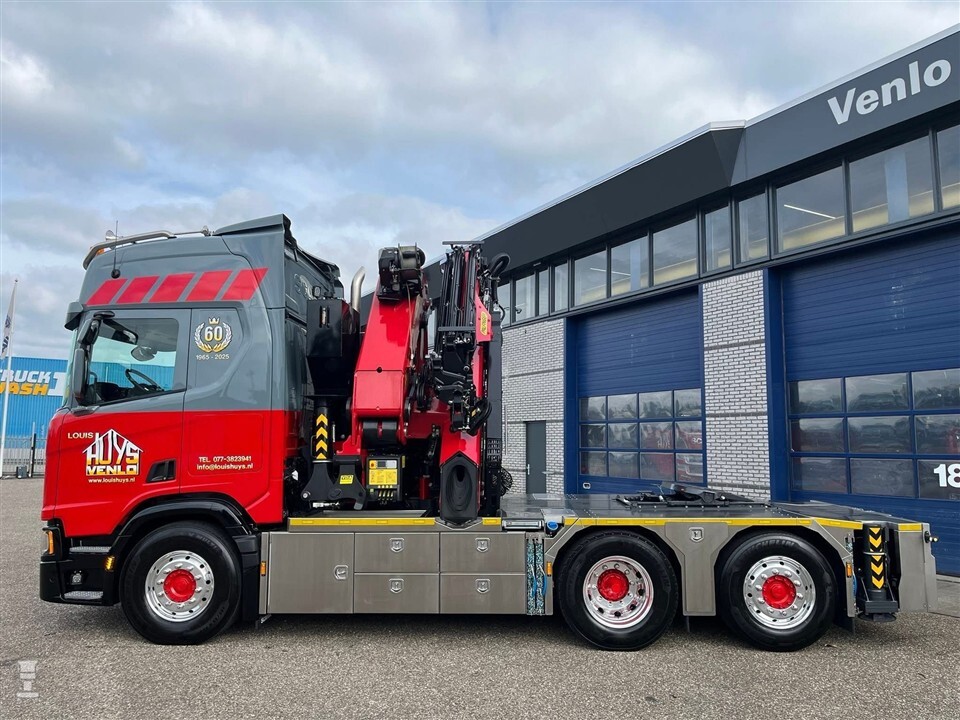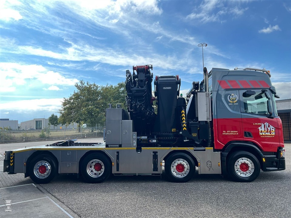 Het gaat hier ook nog eens om een primeur. De Scania R500 8x2 is de eerste vrachtwagen in Nederland die voorzien is van de Palfinger PK 1650 TEC. Deze nieuwe kraan is de opvolger van de PK 165.002 TEC7 en heeft een vlucht van niet minder dan 20,8 meter. Hier kan de kraan altijd nog 4.750 kilo tillen. Met een fly-jib gaat de gestrekte vlucht zelfs naar 33,4 meter. Uiteraard is de Scania Super tot in de puntjes opgebouwd, met veel handige RVS kisten.