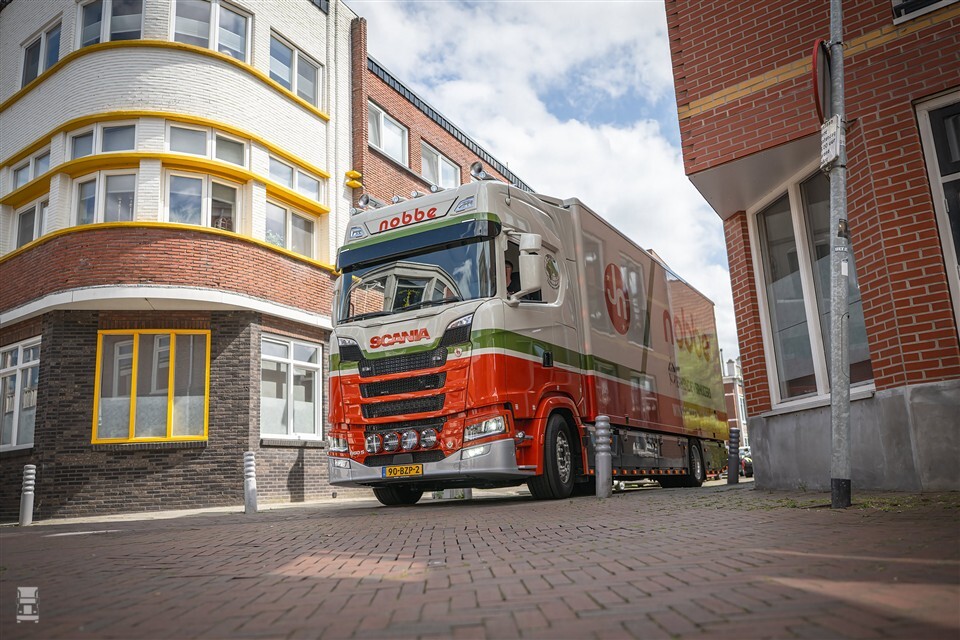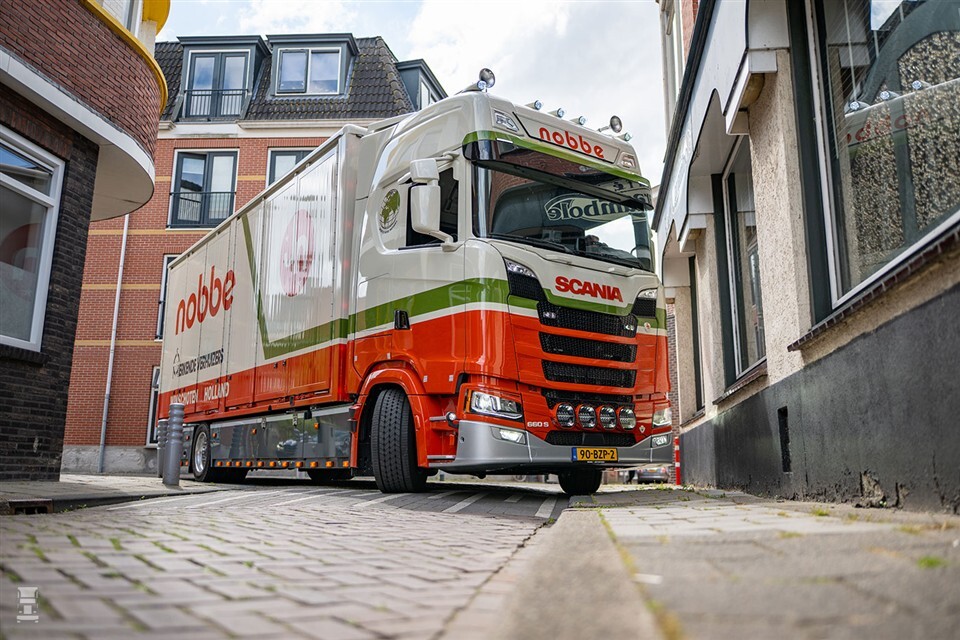 De Scania 660S is uitgevoerd met acht twistlocks voor containervervoer en wordt in de dagelijkse praktijk veel ingezet met een tweeassige schamelaanhanger. Deze opstelling biedt operationele flexibiliteit, bijvoorbeeld bij het gelijktijdig vervoeren en wisselen van meerdere laadbakken bij complexe verhuizingen of projecten binnen de meubelindustrie. De Scania is gespoten in de typische huisstijl van Nobbe.