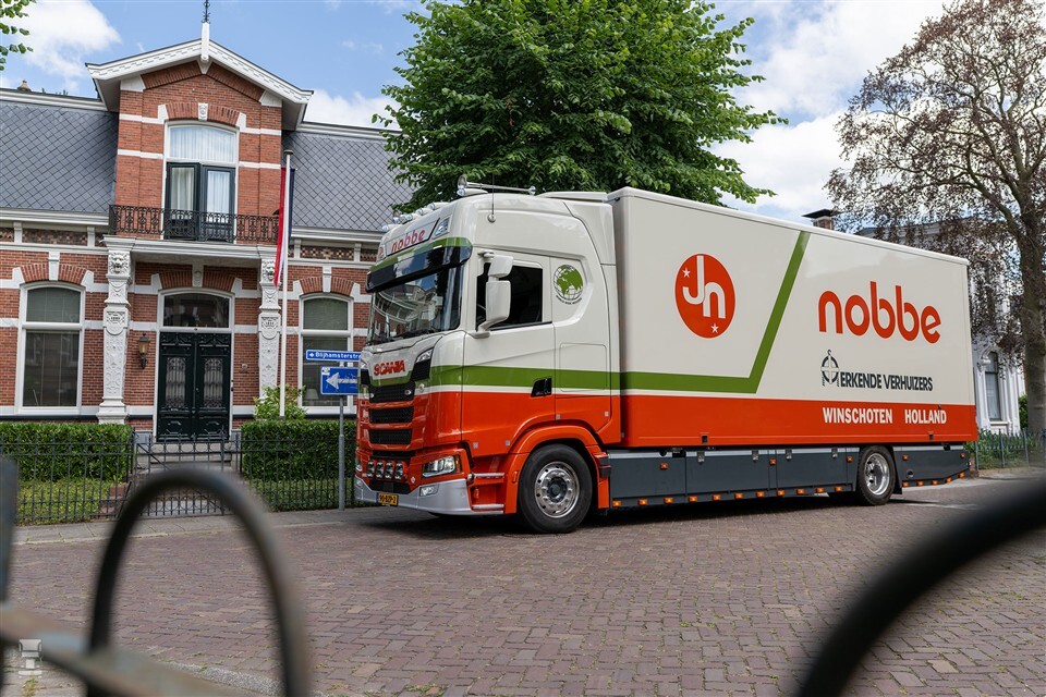 “Wij wilden een krachtig statement maken op de weg, en dan kom je vanzelf bij deze configuratie uit,” zegt Marco Jongeneel, samen met Sven Jongeneel directeur-eigenaar van Verhuisbedrijf Nobbe. “Dit voertuig combineert functionaliteit, uitstraling en traditie ineen.” Krachtig is de nieuwe Scania verhuiswagen zeker, met de 660 pk sterke V8 onder de cabine. De bakwagen is voorzien van luchtvering rondom, standairco en uiteraard alle veiligheidssystemen.