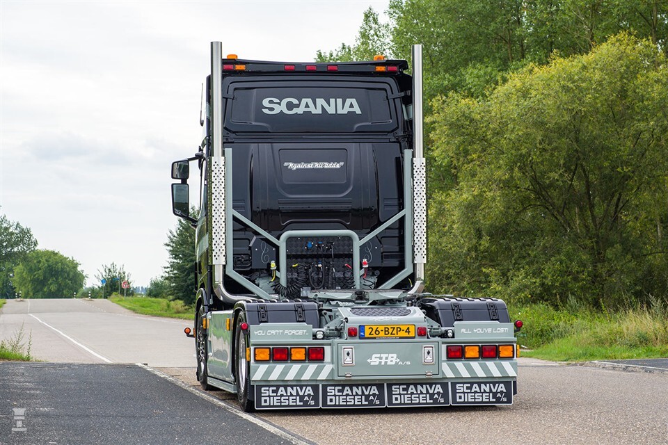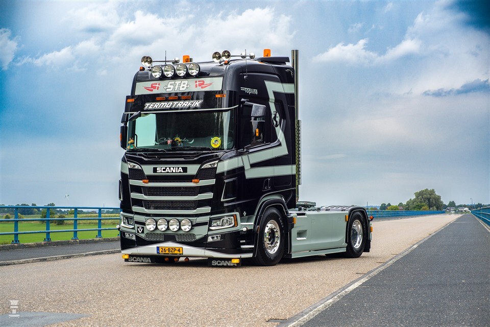 De zwarte trekker staat vol spreuken en afbeeldingen die erg persoonlijk zijn voor Gerrit Jan. “Deze teksten en symbolen zijn voor mij meer dan decoratie. Ze houden herinneringen levend en maken de truck écht van mij”, vertelt hij. “Ik ben met niks begonnen. En kijk nu eens. Ja, ik ben er trots op. Echt.” Tijdens de open dag van Scania Nijmegen trok de trekker van STB a/s ThermoTrafik veel bekijks. Gerrit Jan: “Dan doe je het ergens voor. Als liefhebber ben ik gewoon ontzettend trots. Dit is waarschijnlijk mijn laatste truck, dus die moest perfect zijn.”