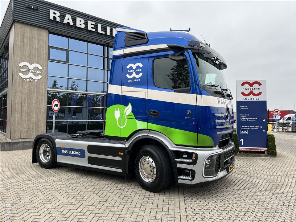 Veel chauffeurs vinden het kale, bolle front van de ProCabin een stap achteruit ten opzichte van het vorige model Actros. Zeker in het wit oogt de cabine vrij kaal. Het is daarom interessant om te zien hoe bedrijven deze ruimte invullen. We hebben al strepen en patronen gezien, maar Rabelink Logistics gaat een stapje verder. De twee nieuwe eActros 600 trekkers die het bedrijf in gebruik heeft genomen, hebben gewoon een grille.