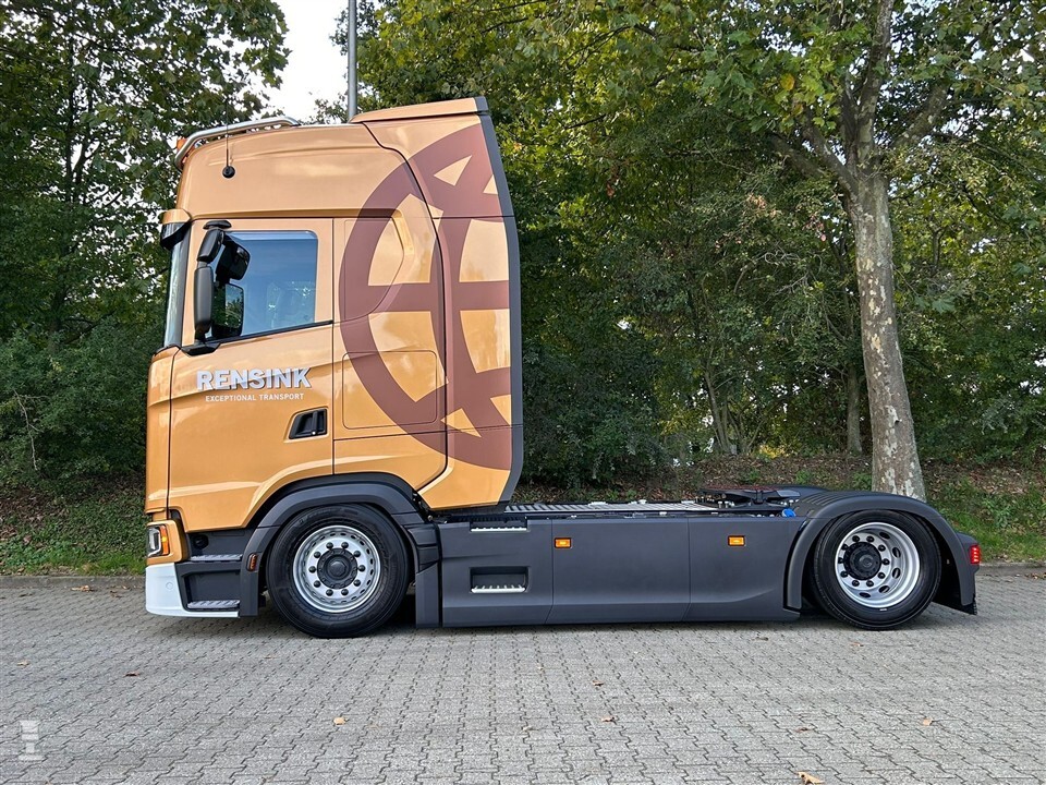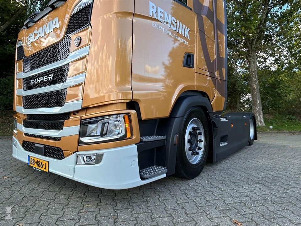 Het is alweer de tweede Scania R500 4x2EB 20 Highline Mega die Rensink mag ontvangen. De trekker staat erg laag op de kleine wielen, wat toch altijd weer een bijzonder gezicht is. Een echte lowrider! Met het hoge Highline-dak en in de bedrijfskleuren van Rensink staat hier echter weer een mooie Scania. Uiteraard konden ook zwaailampen en verstralers op het dak niet ontbreken.