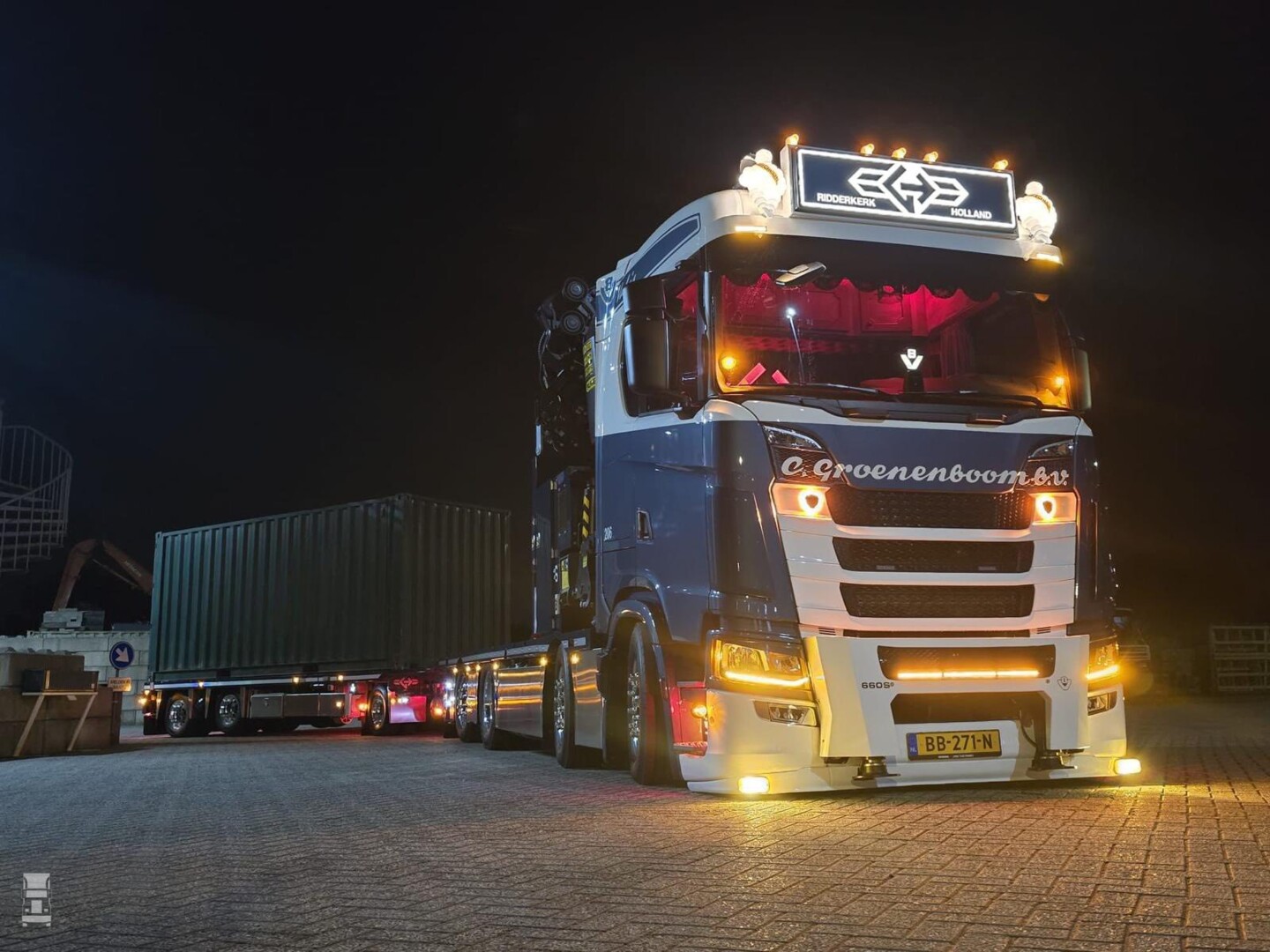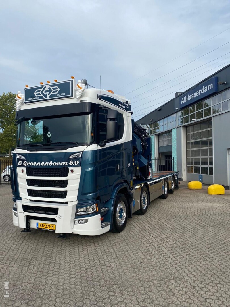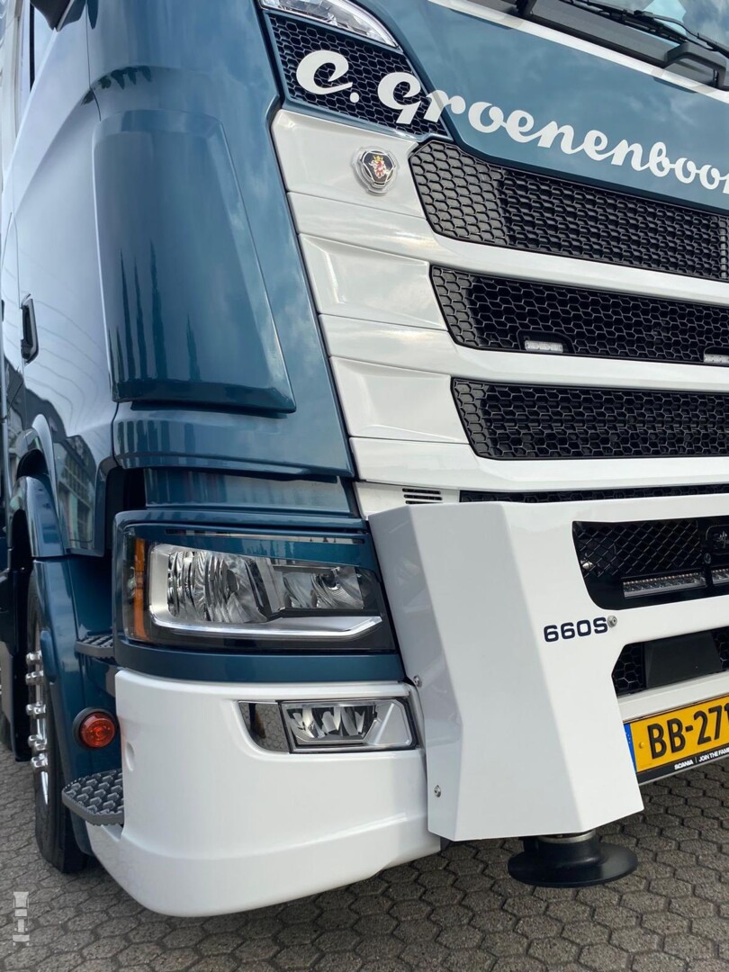 De Scania is voorzien van alle luxe en comfort met rondom luchtvering, een retarder, het King of the Road pakket en het LED Premium pakket. De truck is verder uitgerust met accessoires van M&M Truckstyling, met onder meer speakers in het kopschot! Verder werd de truck voorzien van een lichtbak, windkappen, een diepe onderspoiler en voorafstempeling, waardoor de autolaadkraan 360 graden rond het voertuig ingezet kan worden.