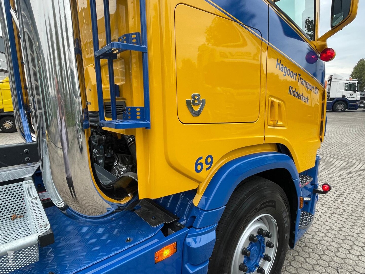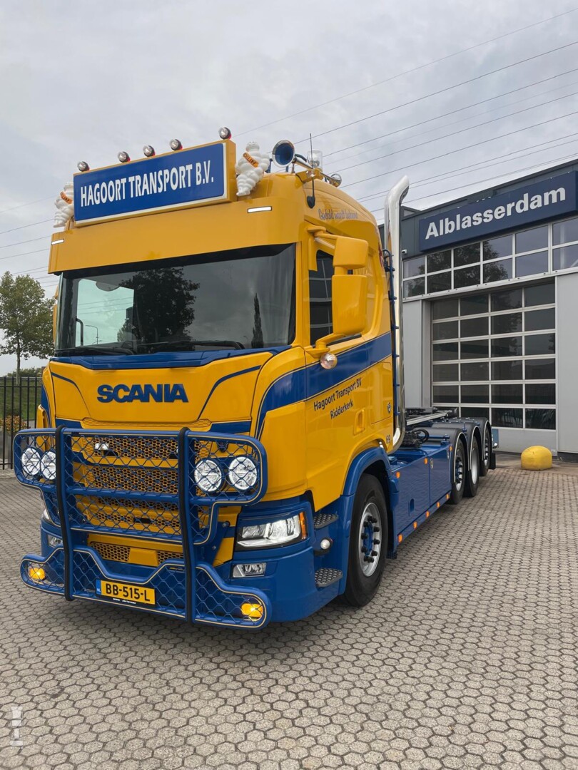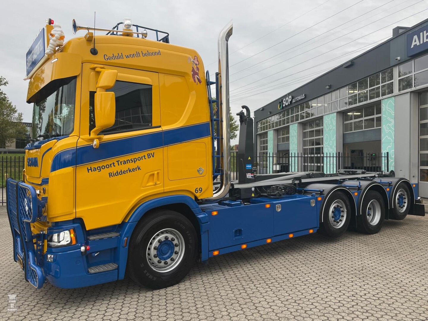 'Geduld wordt beloond' staat er op de spatlap maar vorige week was het dan echt zo ver dat Alex zijn nieuwe V8 kon afhalen. Samen met Bevako, Dubbeldam Zwijndrecht, Voskamp Truckstyling, van de Hoeven Truckstyling is de Scania tot in de puntjes uitgevoerd. De truck is volledig luchtgeveerd en is uitgerust met het King of the Road pakket, een retarder en een groot aantal opties. Zo zien we een verlengde zonneklep, een stoere lichtbak en hoekschildjes. Alles bij elkaar een plaat van een bakwagen. De truck werd afgeleverd door Scania Alblasserdam. Aangezien Scania gestopt is met de productie van de 530 pk V8 moet dit één van de laatste trucks zijn in die uitvoering.