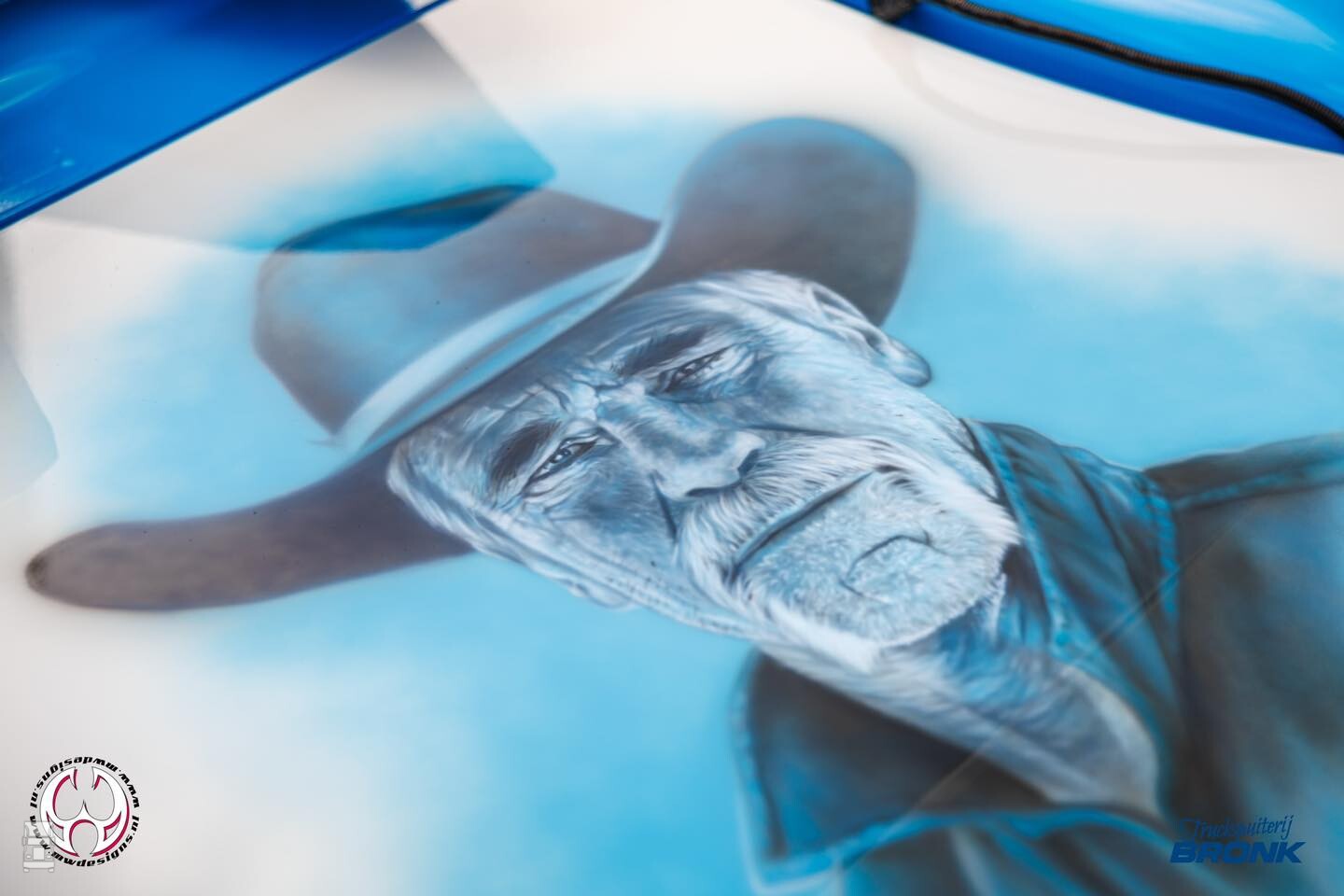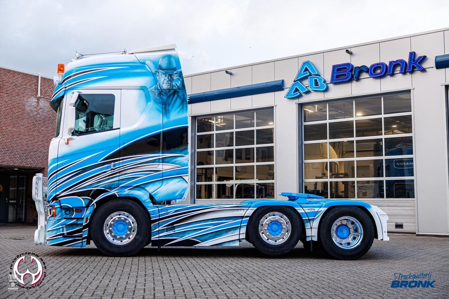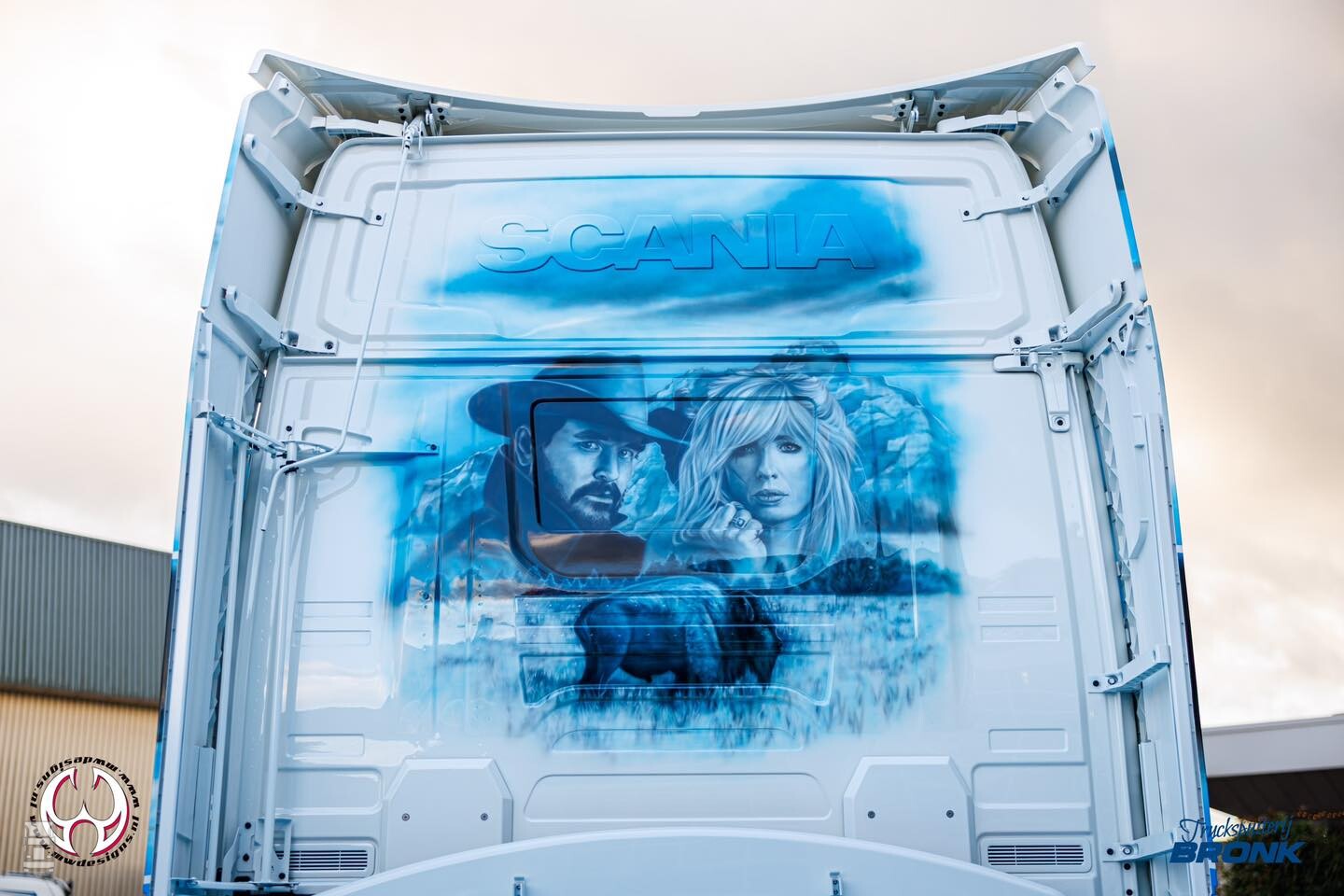 De Scania werd opgebouwd door TSW-Truckstyling met onder meer een bullbar, een stoere lichtbak en een verlengde zonneklep. Ronduit spectaculair is het spuitwerk, met veel lijntjes die overal keurig doorlopen. Ook als je de deuren open doet loopt het lijnenspel door, ook aan de binnenkant van de deuren. Best ingewikkeld met al die rondingen en het aantal lijnen. Ook het special paint werk is bijzonder fraai geworden, met stoere cowboy's uit de serie Yellowstone. Eigenlijk is het enige wat mist aan deze truck een TIA Cowboy Club lichtbakje!