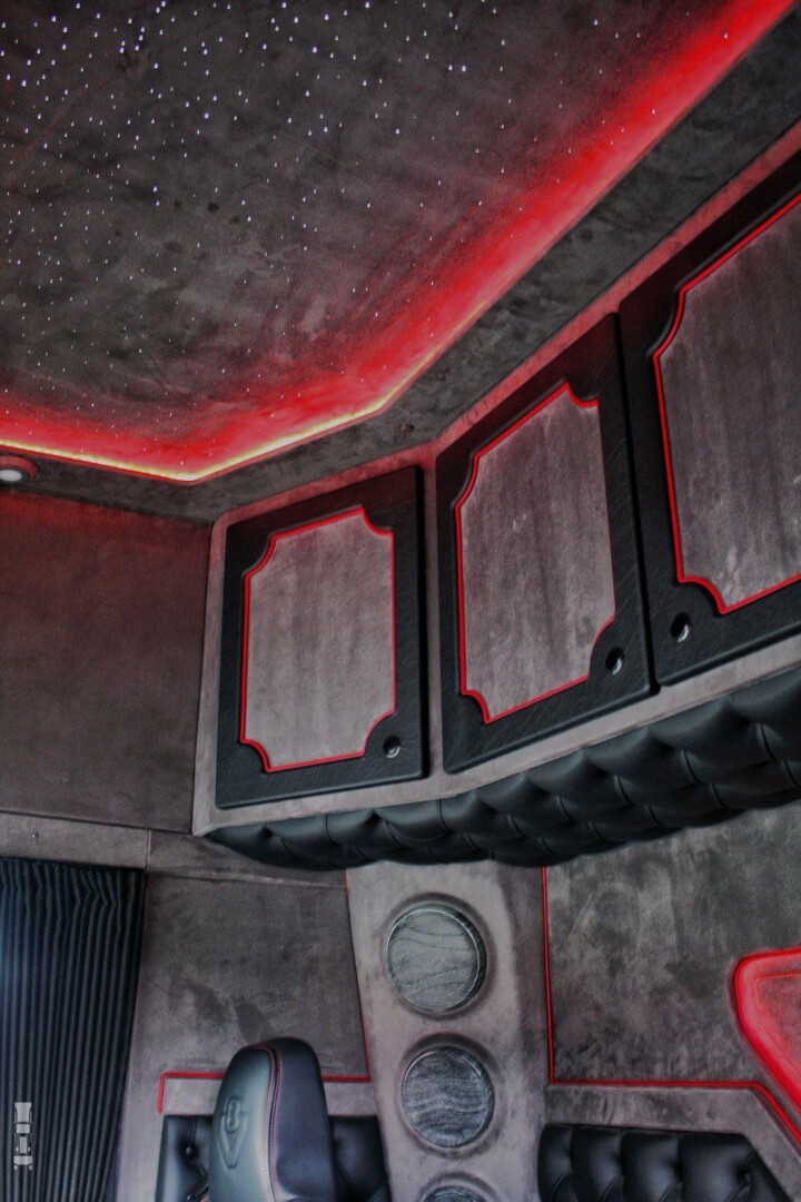 Binnen is alles leer wat de klok slaat. Zelfs de vloerbedekking. Ook het dashboard is gespoten door Truckstyling Lunteren. “En alle knoppen zijn gedipt”, vullen Gerrit en Cornelis aan. “Bovendien hebben we een sterrenhemel laten inbouwen. Alleen het met leer beklede stuurwiel is origineel gebleven. En verder is hij natuurlijk helemaal perfect uitgerust met een high-end geluidsinstallatie met subwoofer, ingebouwde koffiezetter, kastenwand achterin, en zelfs luidsprekers in het kopschot voor muziek tijdens het laden en lossen van de machines.”