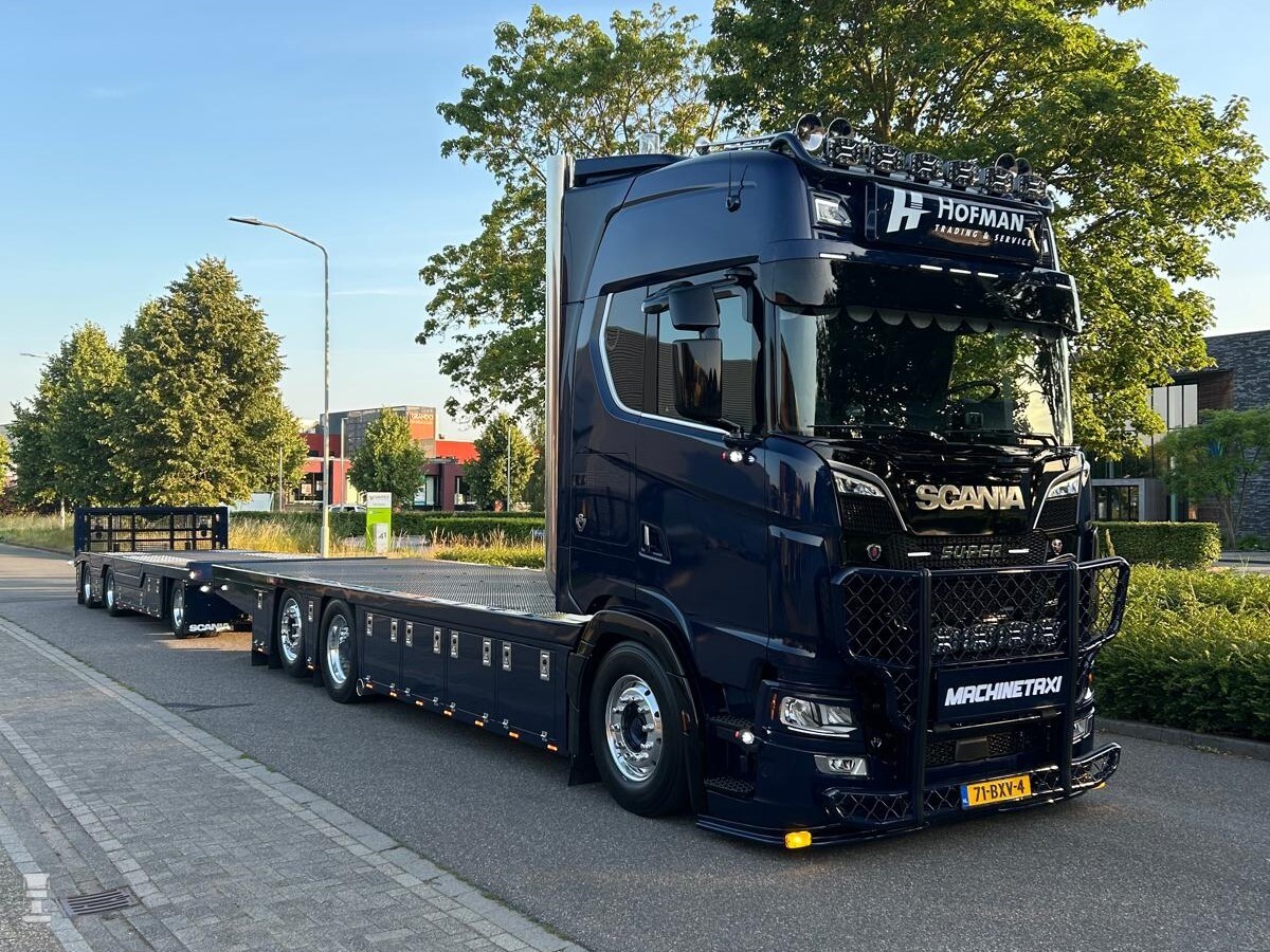Showtruck of niet, er gaat stevig mee gewerkt worden. “Erachter komt een drie-assige lage aanhangwagen voorzien van wielkuilen. Dan kunnen we ook grotere shovels laden. Want we rijden door heel Europa met onze handel van en naar Winterswijk. Er zitten meer handigheidjes aan deze truck. Zo is de laadvloer van de truck niet alleen vlak met voldoende sjorogen en vastzetpunten en special made opbergkasten eronder voor alle kettingen en spanbanden. Nee, hij is ook via de PTO uitschuifbaar naar achteren. Dan hoeven we niet af te koppelen, maar kunnen we de machines vanaf de aanhangwagen zo doorrijden naar de truck. Onze chauffeur is gemiddeld drie dagen in de week onderweg door Duitsland, Frankrijk, Oostenrijk en noem maar op.”