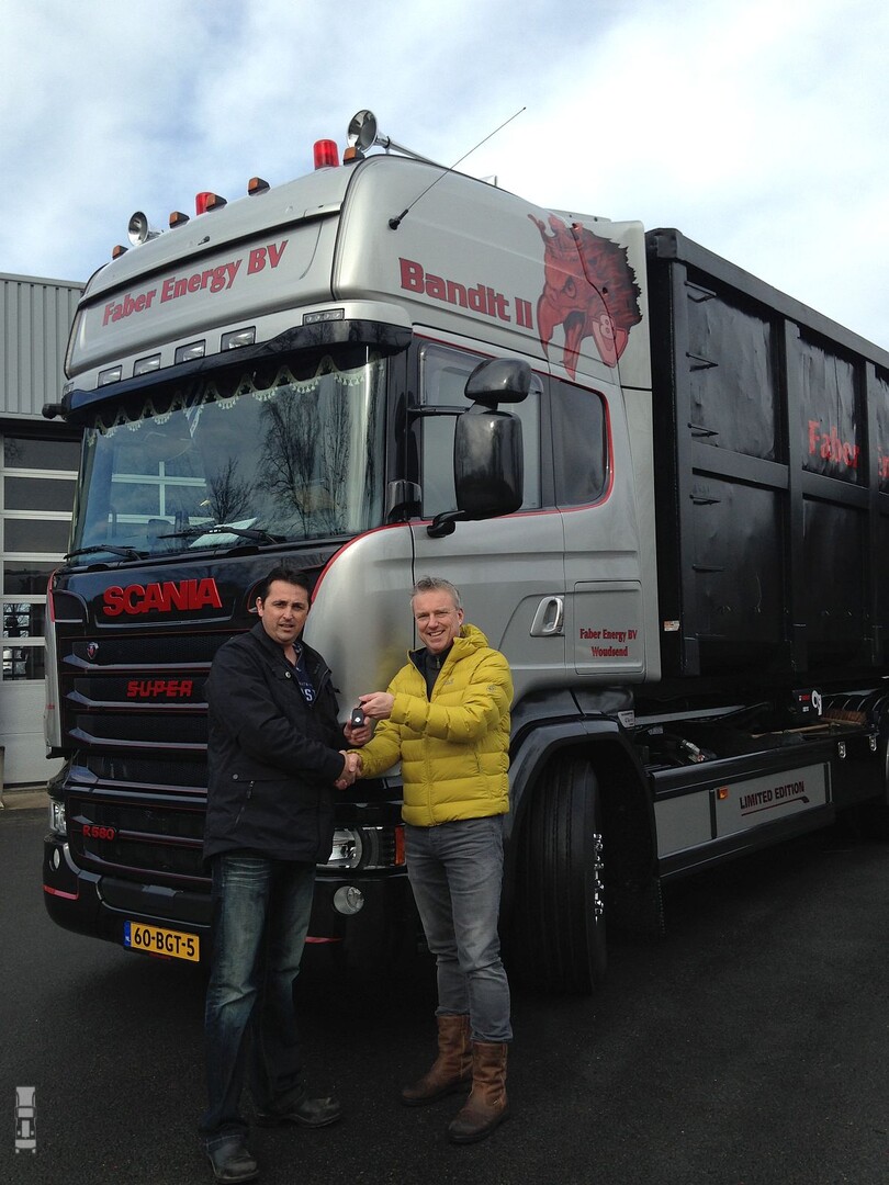 “Wij, als Faber Energy B.V., verzorgen de inkoop en verkoop van biomassa voor energiecentrales en land- en tuinbouw,” vertelt accountmanager Wim Faber. “Wij waren op zoek naar een derde truck voor ons bedrijf. Hoewel onze huiskleuren zwart met rood zijn, hadden we vorig jaar al een Scania R580 V8 Topline gekocht in de Red Passion uitvoering. Deze uitvoering vond ik persoonlijk heel mooi. Voor onze derde truck wilden wij weer iets aparts als visitekaartje. Onze voorkeur ging er wel naar uit om nog een Scania aan te schaffen, dus begon ik bij de dealer allemaal op te sommen waar de nieuwe truck aan zou moeten voldoen. Alleen bleek dat allemaal bij elkaar opgeteld duurder dan een truck in de Silver Griffin uitvoering, die zelfs nog meer bood. Mijn broer Johnny vond de Silver Griffin een fantastische truck met zijn vele extra’s, dus was de keuze snel gemaakt. Bij de berekening hebben we ook naar de lange levensduur en de hogere inruilwaarde gekeken. Wij rijden minstens acht jaar met een voertuig. Over die periode voel je de extra investering nauwelijks en daarvoor hebben we elke dag een chauffeur op de bok die met veel plezier zijn werk doet.”