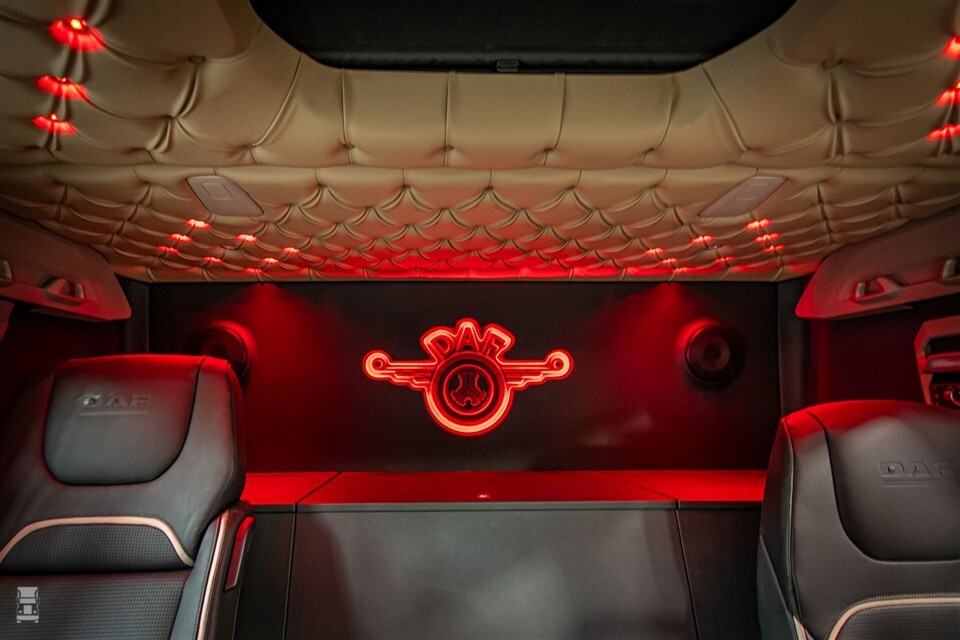 Van Winkoop gaf de XF een mooie laag blauwe lak. De opbouw bleef bescheiden, met een aangepaste zonneklep, enkele flitslampen en een zwaaibalk op het dak. Achter de cabine werd een slangenrek opgebouwd en extra verlichting. In de kisten is gereedschap netjes weggewerkt. Ook het interieur werd onder handen genomen, met knoppenleer tegen het dak en een verlicht DAF-logo tegen de achterwand. Zo zie je maar: voor een stoere truck hoef je niet altijd het grootste model te kiezen.