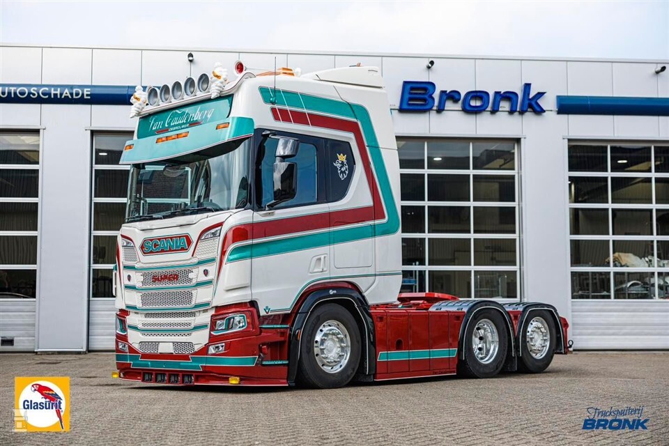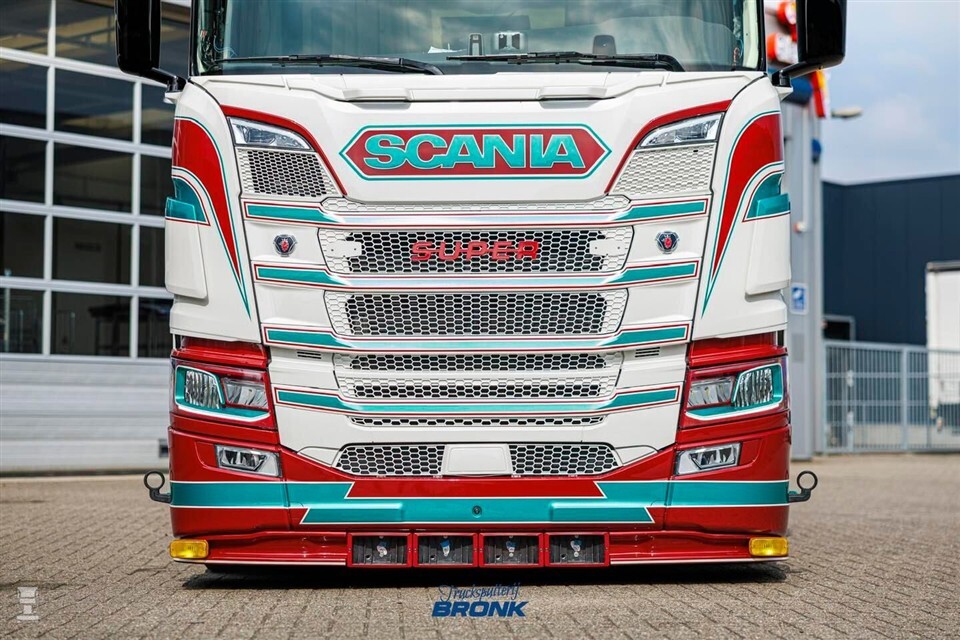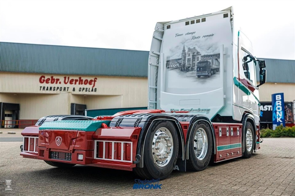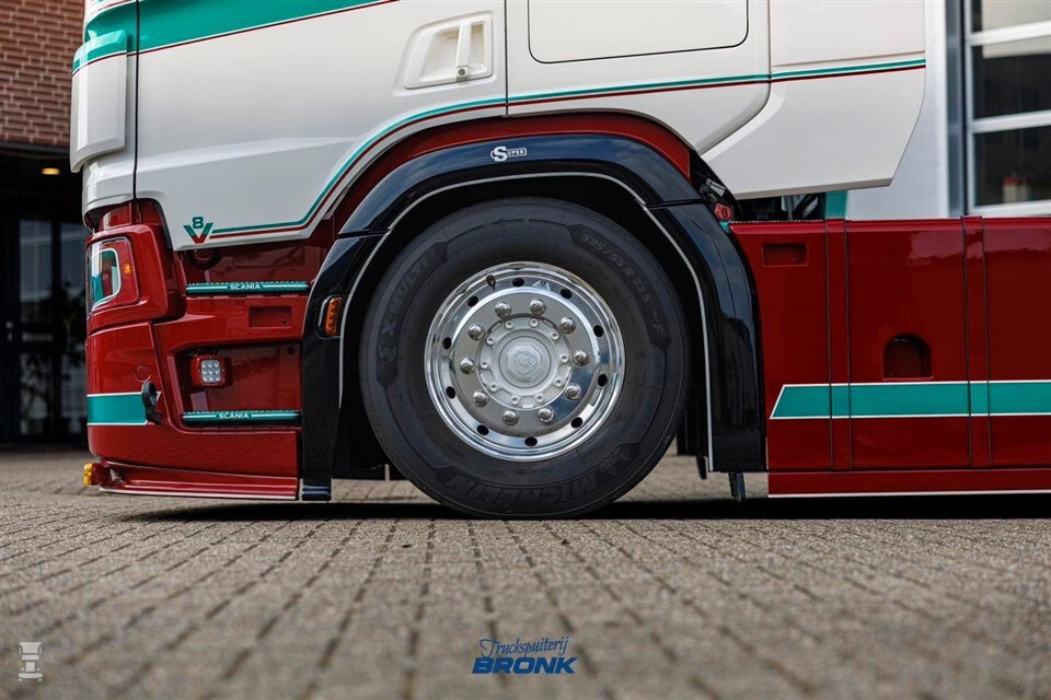 Op de foto’s is de vrachtwagen nog niet helemaal af, maar ze geven al een goede indruk van het eindresultaat. De Scania is door Truckspuiterij Bronk, aangesloten bij Barbatruck, gespoten in de mooie bedrijfskleuren. Het is een waar kunstwerkje geworden, kijk maar eens naar de details en de koplampen. Peter Evers van KimMae voorzag de achterwand van een nostalgische airbrush van een Volvo. De Scania is opgebouwd door Steve’s Place Truckstyling. Pennings Interieurs nam de binnenkant van de cabine onder handen.