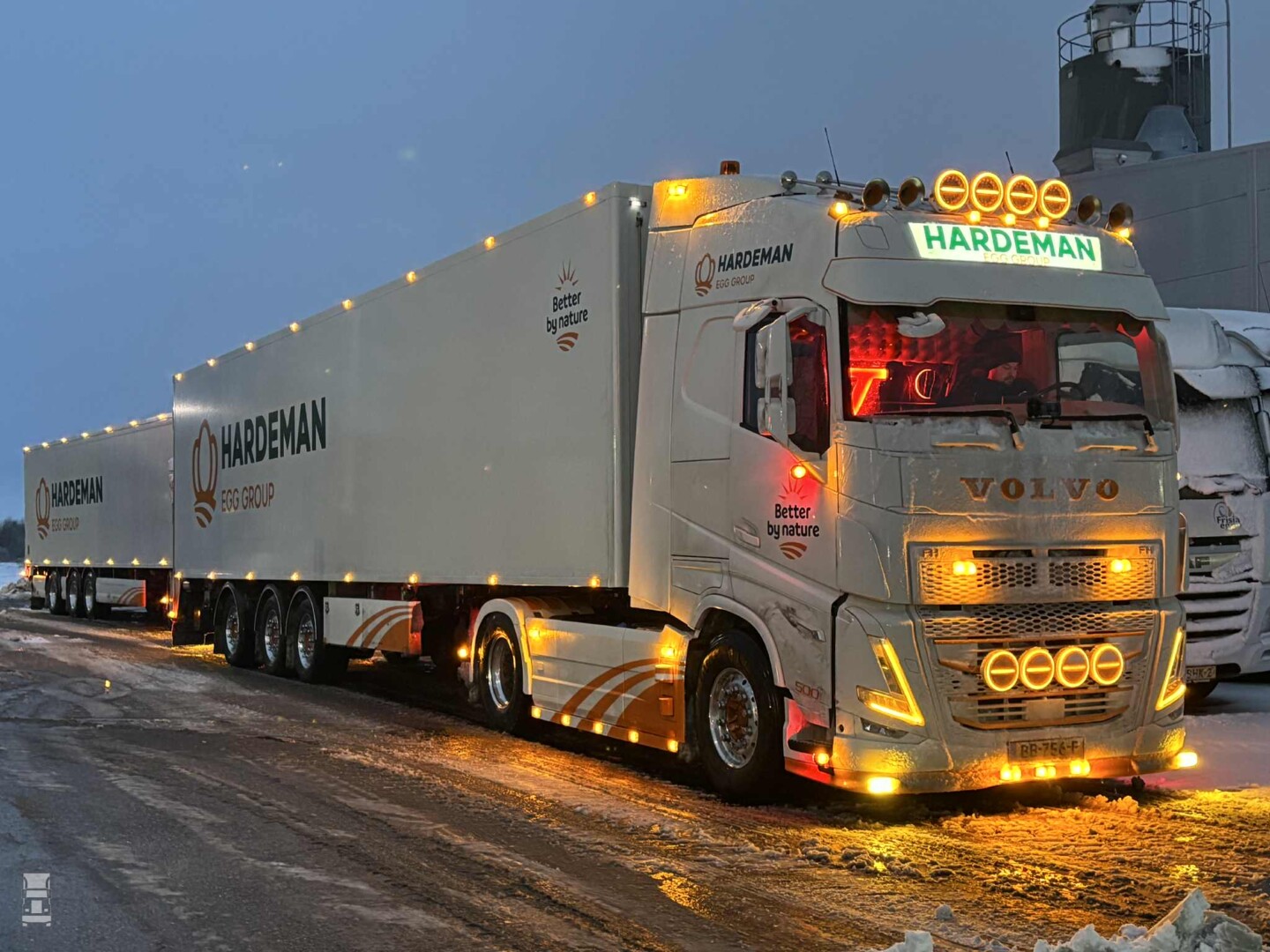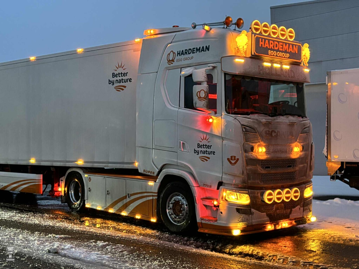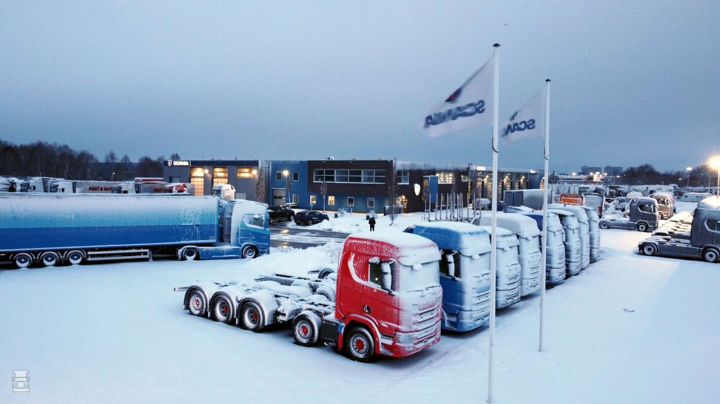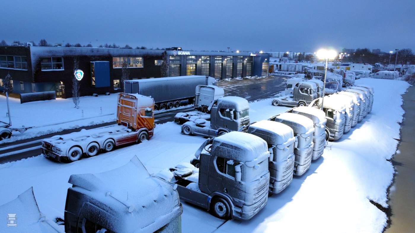 Wat je hier ziet is geen Scandinavische Scania dealer, maar gewoon Scania dealer Rinsma in Drachten. En over die 'Code oranje', het weer heeft vooral in Oost- en Noord Groningen wel geleid tot afsluitingen van wegen vanwege sneeuwduintjes, maar verder vielen de gevolgen erg mee. Er was zelfs beter te rijden dan een paar dagen geleden, toen zelfs sneeuwschuivers vastliepen door gladheid. Natuurlijk waren er ook vandaag de nodige glijpartijtjes, maar zover ons bekend zonder ernstige gevolgen. Het liep dus met een sisser af met die horrorwinter op 9 januari, maar we zijn er nog niet. De komende dagen gaat het stevig vriezen en wordt er ijzel beloofd. Rustig aan dus, en hou hem tussen de lijntjes ook al kun je ze niet zien.